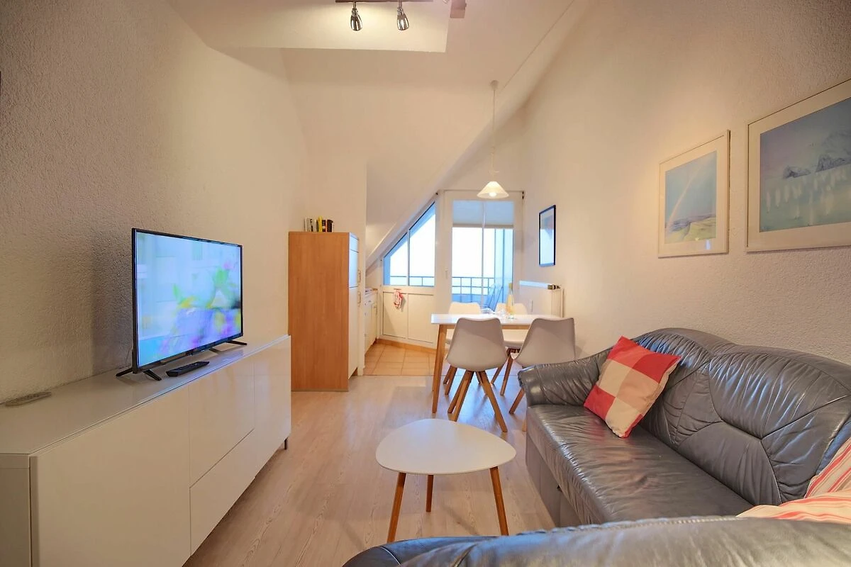 Der Wohnraum bietet den Gästen Eck-Couch, Flachbild-TV, DVD-Player, Stereoanlage sowie Essplatz für 4 Personen. Hier ist auch die offene Küchenzeile mit Spülmaschine, Ceranfeld, Kühlschrank mit separatem Gefrierschrank und Mikrowelle-Backofen-Kombi integriert. Von hier aus erreicht man den überdachten, möblierten Balkon und kann den wunderbarten Blick auf die Ostsee genießen.