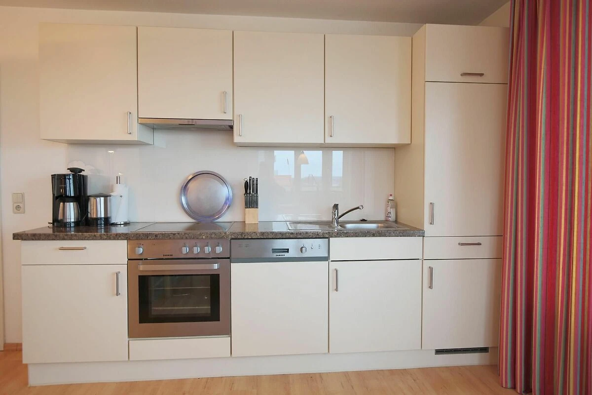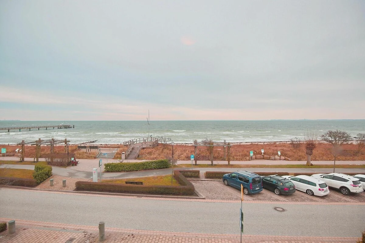 Moderne 2-Zimmer-Wohnung in Haffkrug, 2. OG mit Süd/Ost-Balkon und Meerblick. Sie verfügt über einen gemütlichen Wohn-Schlafraum mit komfortabler Doppelbettcouch, Kabel-Flat-TV. Die offene Küchenzeile ist ausgestattet mit Backofen, Geschirrspüler, Kühlschrank mit Gefrierfach usw. Der große Erker mit Ess-Platz für 4 Personen, bietet einen herrlichen Ausblick. Schlafraum mit Doppelbett (Boxspringbett (1,80 x 2,00m, 1 Topper durchgehend). Dusche/WC. Das Appartement ist komplett mit Laminatboden versehen. Ein PKW-Stellplatz steht hinter dem Haus zur Verfügung.