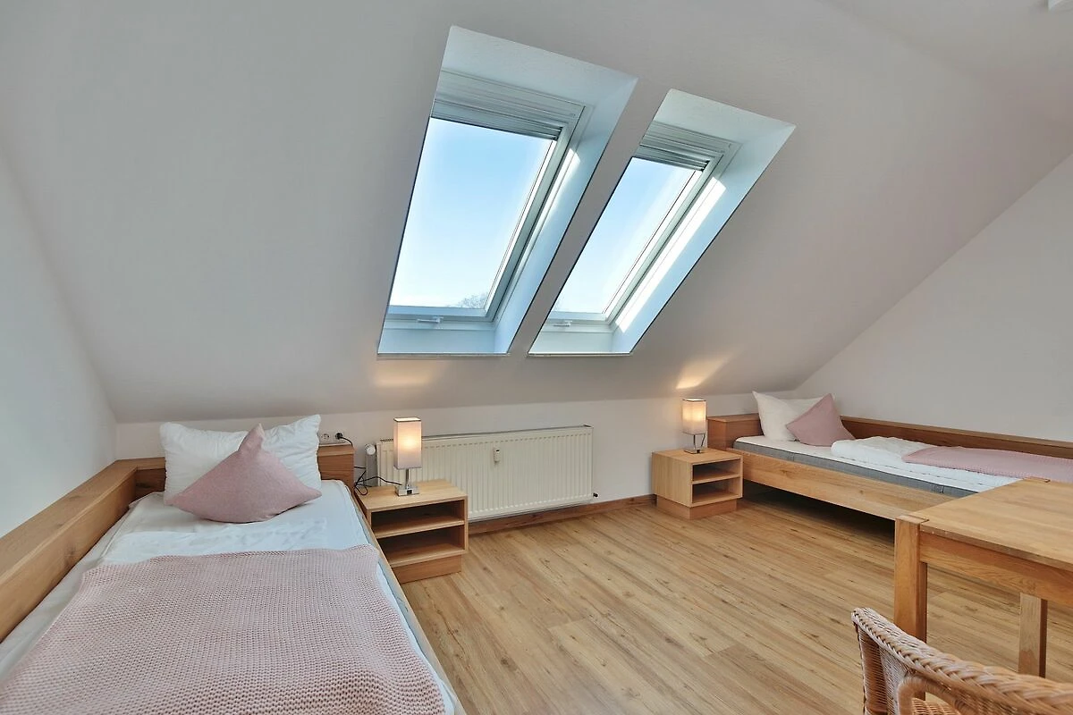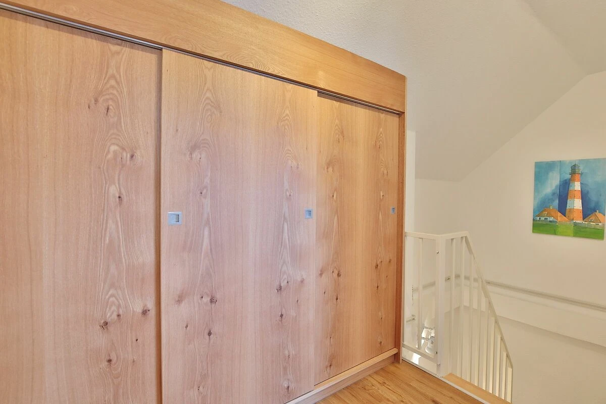 Über eine Treppe gelangen Sie in den oberen Bereich. Dort befinden sich zwei weitere Schlafzimmer, eins mit einem Doppelbett (1,60 x 2,00 m) und großem TV (42 Zoll) sowie das zweite mit zwei Einzelbetten (0,90 x 2,00 m). Hier haben Sie auch ein weiteres Duschbad mit WC. Ein Telefon steht den Gästen zur Verfügung (nur für Notrufe!!!)