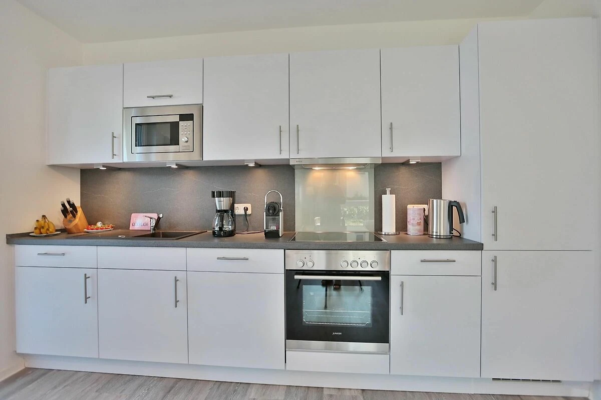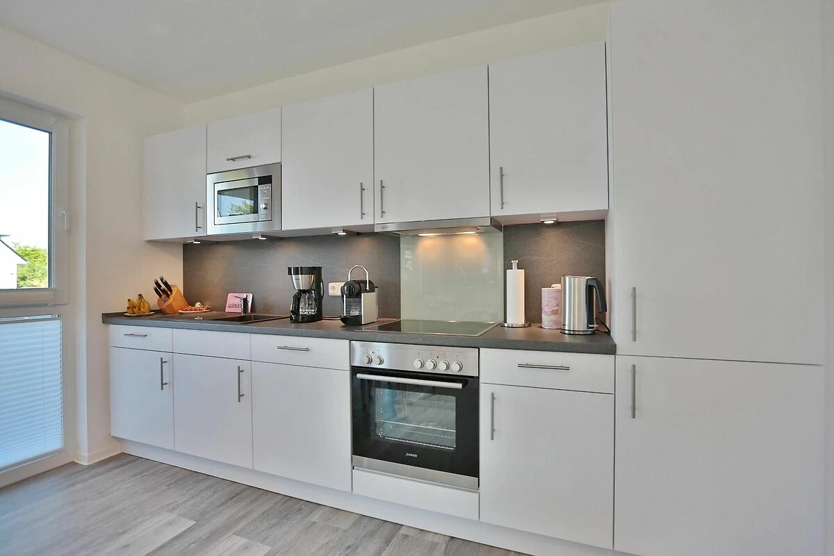 Die gut ausgestattete, offene Küche mit Geschirrspüler, Backofen, Ceranfeld, Kühl- und Gefrierkombination sowie Mikrowelle bietet alles, um für die Zubereitung eines schmackhaften Menüs auf nichts verzichten zu müssen. Für den besonderen Kaffeegenuss kann die vorhandene Nespresso-Kapselmaschine genutzt werden.