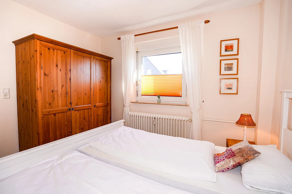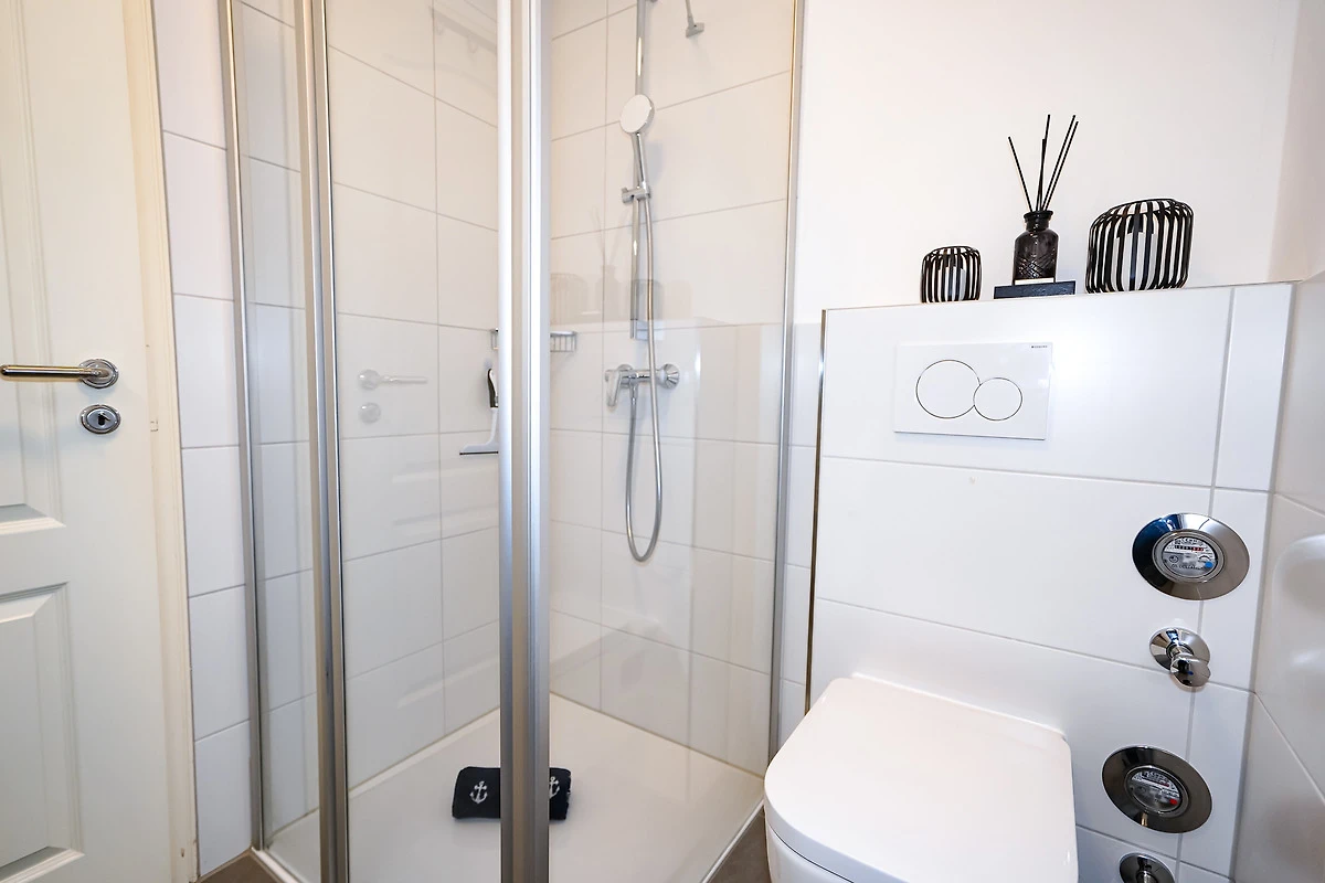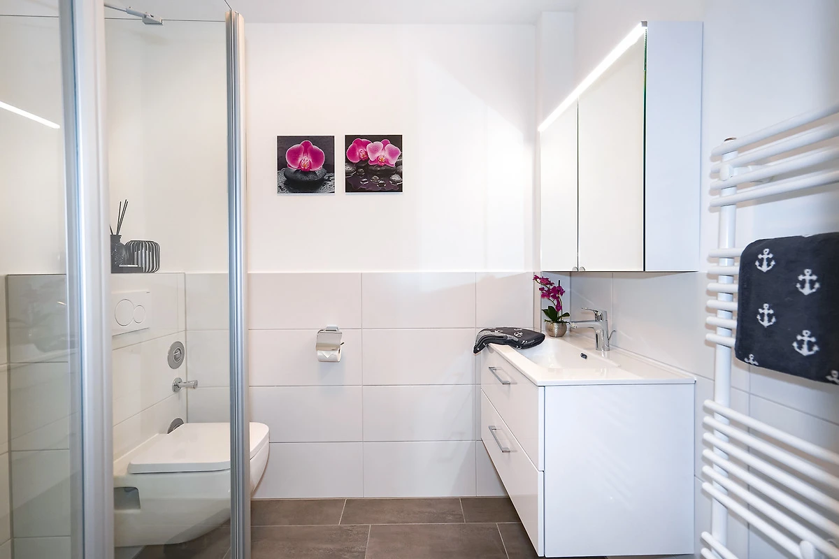 Das separate Schlafzimmer ist mit einem Doppelbett (180 x 200 cm - getrennte Matratzen) und einem Kleiderschrank ausgestattet. Im vollständig modernisierten Badezimmer finden Sie eine Eckdusche, einen grossen Spiegelschrank und einen Handtuchheizkörper vor.
