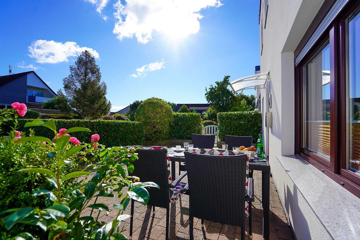 Direkt vor der Wohnung liegt die eigene Terrasse, welche mit einem grossen Tisch, Stühlen und zwei Liegen ausgestattet ist. Entspannen Sie hier nach einem ausgiebigen Tag am Strand, welchen Sie in circa 8 Minuten fussläufig erreichen.