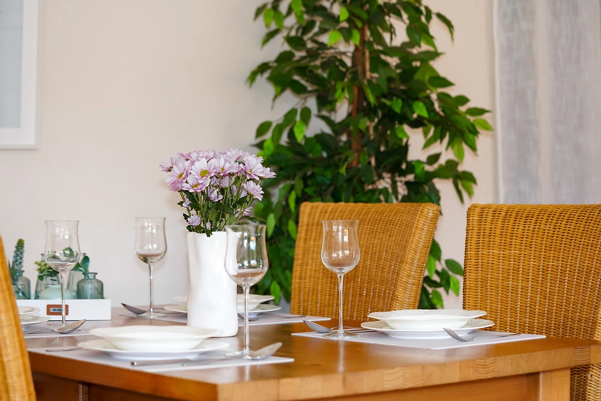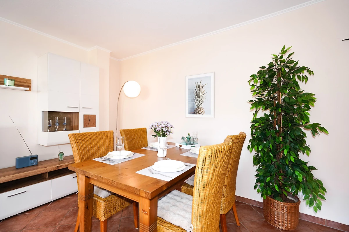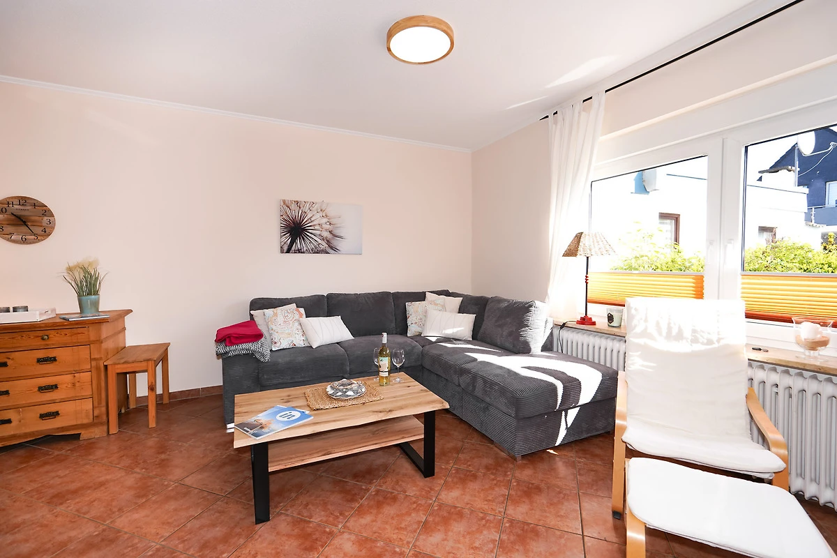 Das helle und freundliche Wohnzimmer verfügt über ein neues Ecksofa, einen Sessel und einen Esstisch. Ein grosser Fernseher, eine Stereoanlage und natürlich kostenloses W-LAN stehen Ihnen hier zur Unterhaltung zur Verfügung.
