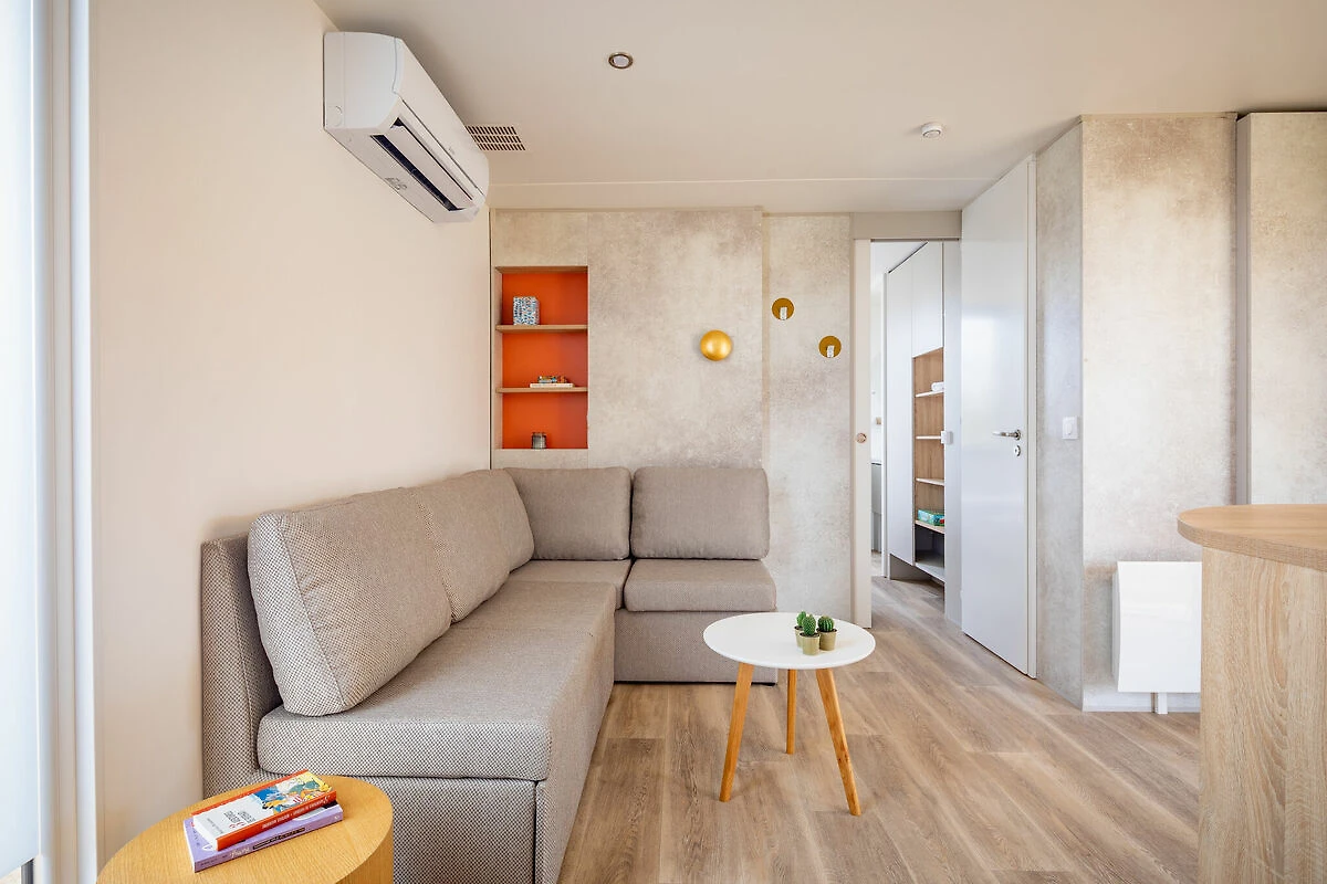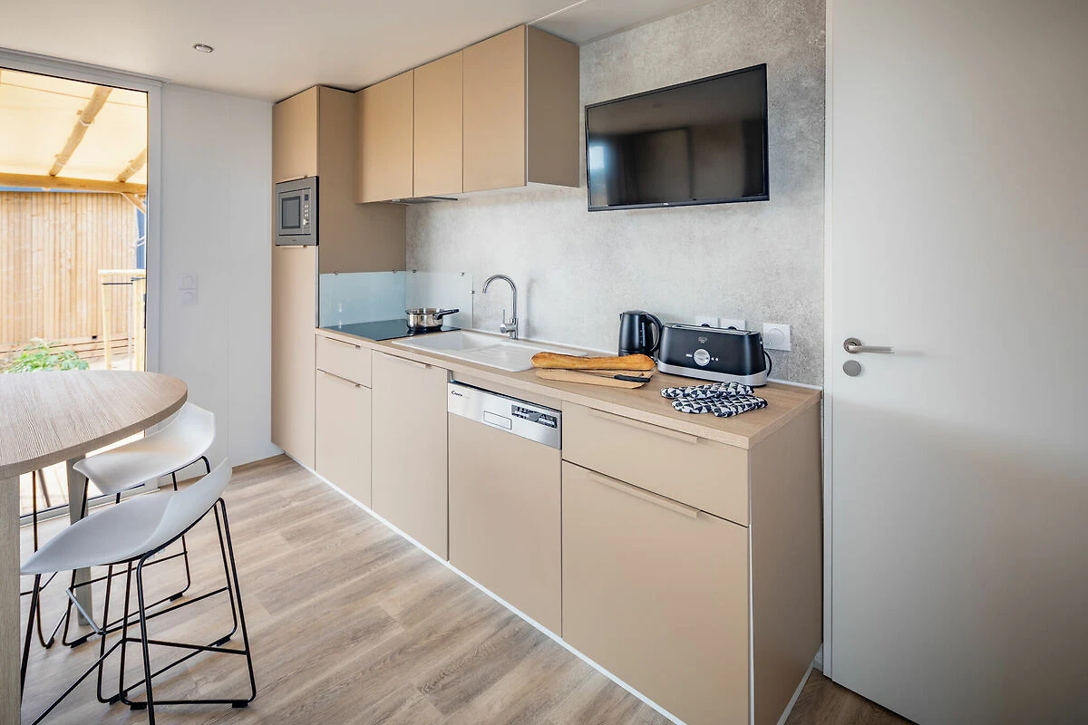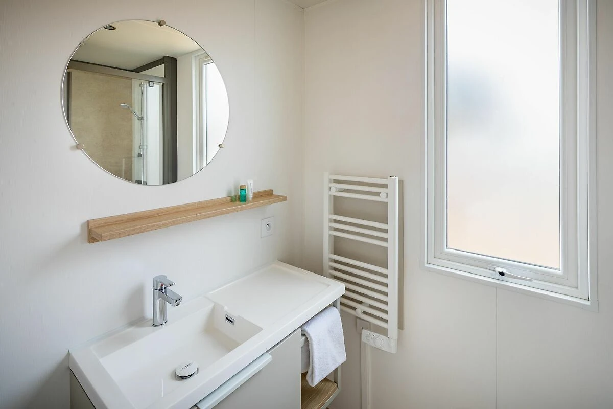 Willkommen in Ihrem stilvollen Rückzugsort im neu eröffneten Beach Resort Agde! Eingebettet in einen ruhigen, autofreien Park, nur 1,5 km vom Mittelmeer entfernt, bietet dieses freistehende, einstöckige Chalet modernen Komfort in historischer Küstenkulisse. Das helle Wohnzimmer verfügt über einen Streaming-fähigen Fernseher für gemütliche Filmabende, während die voll ausgestattete offene Küche mit Geschirrspüler, Kaffeemaschine und Mikrowelle ausgestattet ist. Zwei ruhige Schlafzimmer verfügen jeweils über ein eigenes Bad, wobei das Hauptschlafzimmer über einen Fernseher und ein eigenes WC verfügt. Genießen Sie das ganze Jahr über einen angenehmen Klimakomfort und entspannen Sie auf Ihrer privaten Terrasse mit Gartenmöbeln.