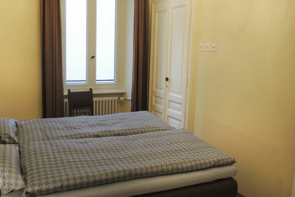 Das ruhige Schlafzimmer ist mit einem komfortablen Boxspringbett ausgestattet – für erholsame Nächte mitten in der Stadt. Das Badezimmer verfügt über eine Badewanne, ein Waschbecken und WC.