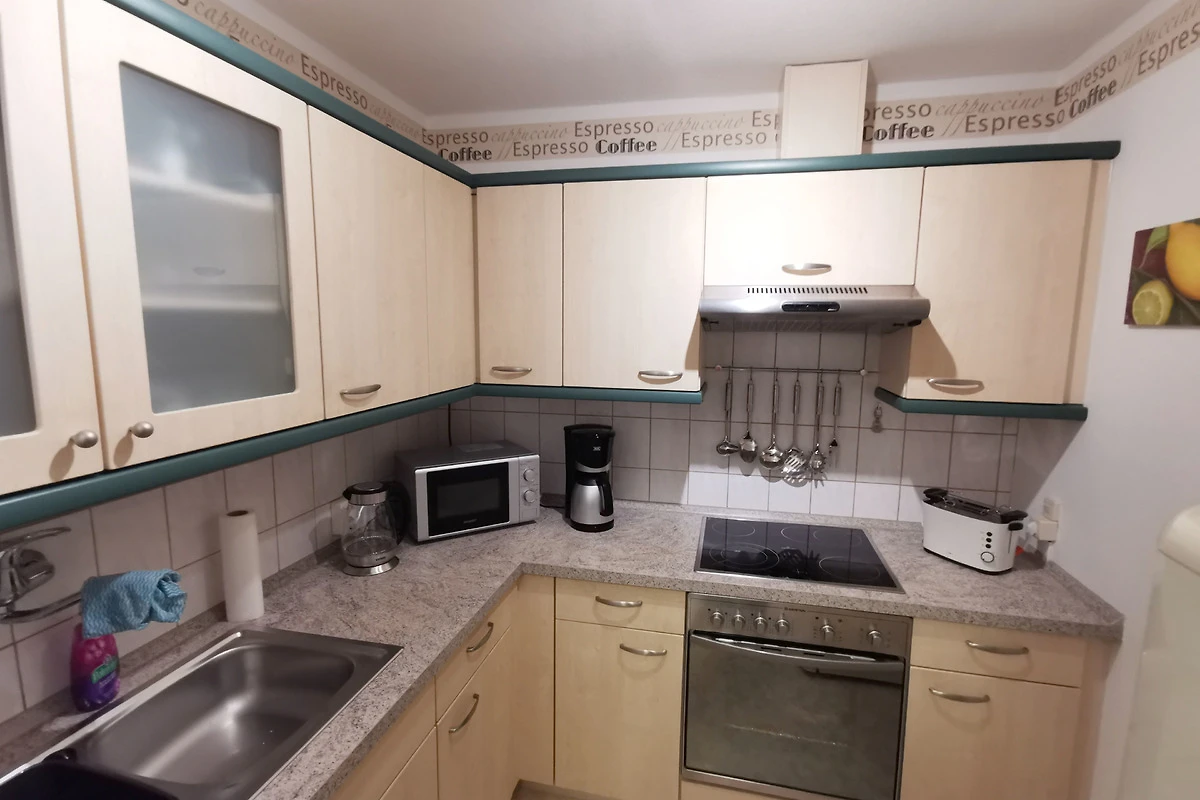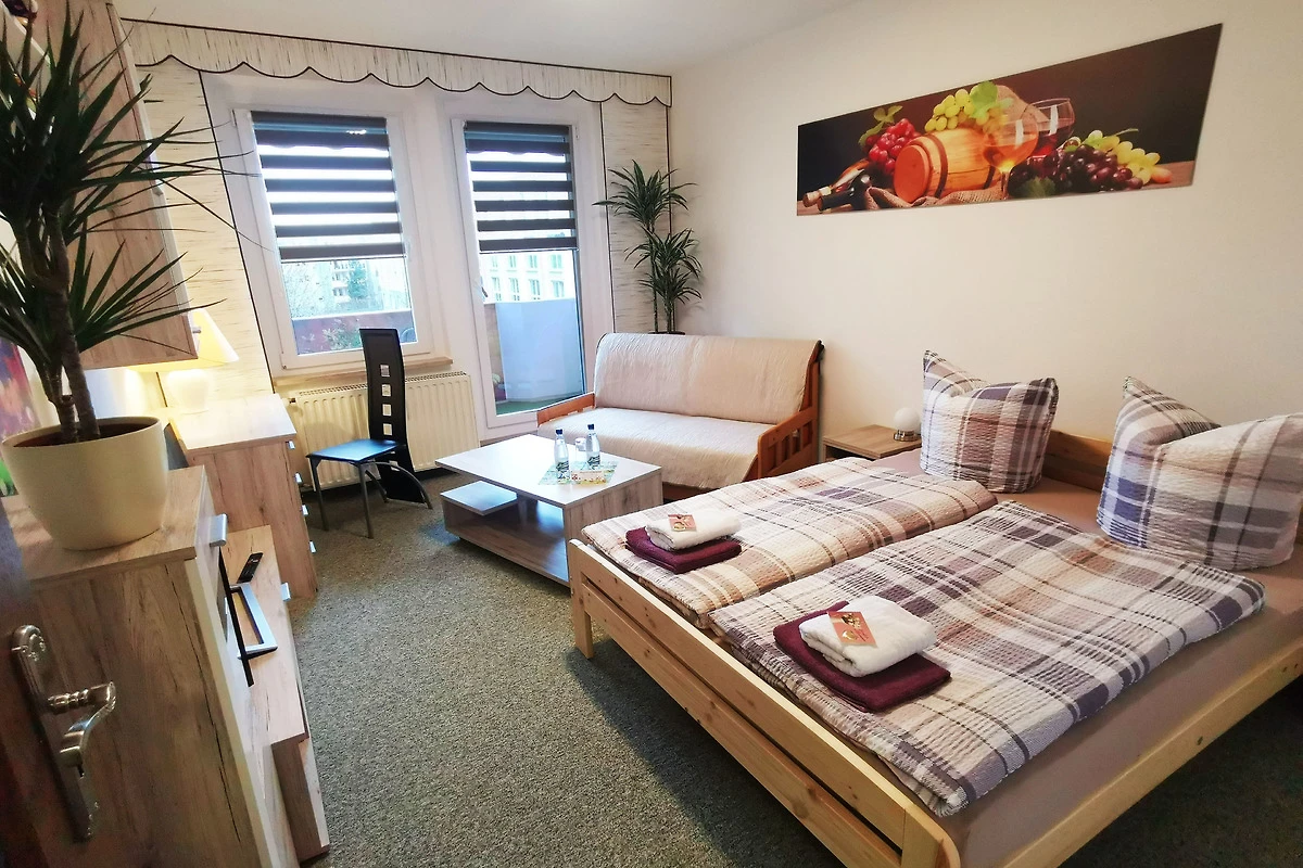 Die 36 qm grosse Fewo besteht aus einer separat abgeschlossenen Wohneinheit . Vom grossen Korridor geht dann der Wohn Schlafbereich,sowie die geräumigen Küche,die mit allem "Drum und Dran"eingerichtet ist ab. Im geräumigen grossen Wohn- und Schlafzimmer ist alles vorhanden was der Gast benötigt. Grosses Doppelbett, Schreibtisch, Sitzecke, Kleiderschrank mit Tresor, TV und Radio. Ein grosser Balkon mit Stühlen und Tisch und sehr schöner Aussicht ergänzt das Ambiente. Kostenloses schnelles WLan und ein gesicherter Parkplatz für Ihren PKW ist für unsere Gäste ebenfalls vorhanden. Natürlich kostenlos.