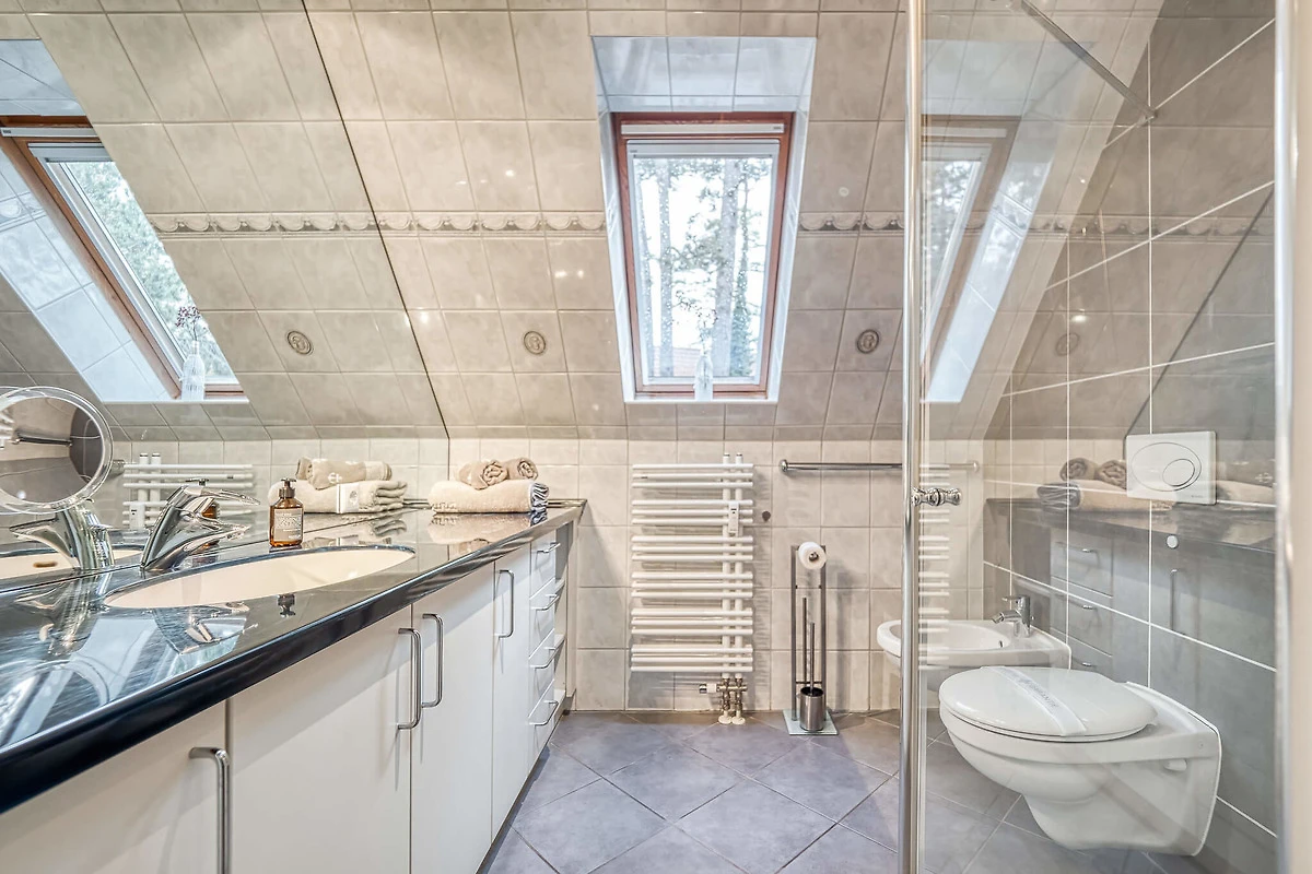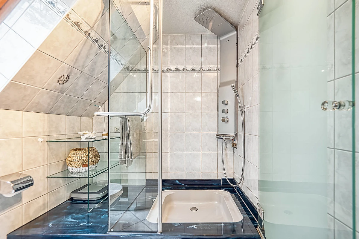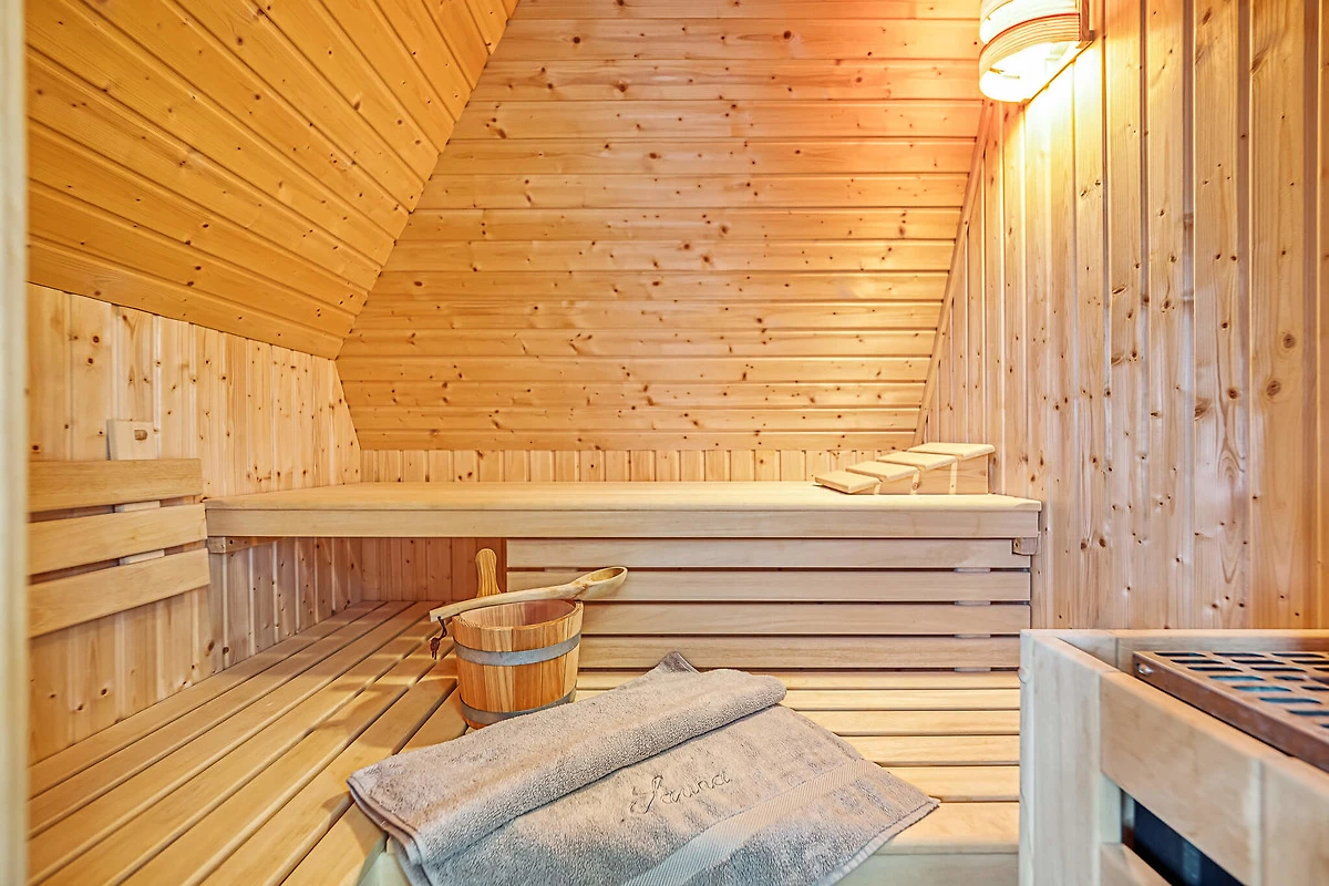 Eine Treppe führt vom Wohnzimmer aus ins Dachgeschoss der Wohnung. Hier finden Sie ein weiteres Schlafzimmer mit Doppelbett, Kleiderschrank, eine Sauna und kleine Relax-Zone zum chillen. Ein zweites Bad steht Ihnen hier mit Dusche und WC zur Verfügung.