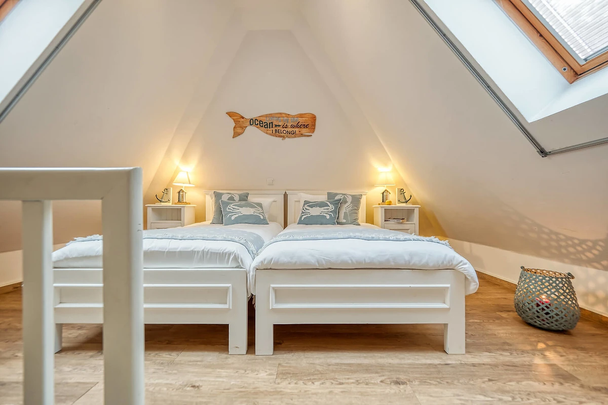 Im Dachgeschoss der Wohnung befindet sich das dritte Schlafzimmer mit 2 Einzelbetten. WLAN wird über Hotspot zur Verfügung gestellt.