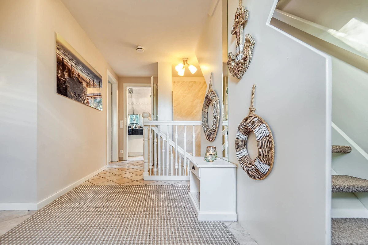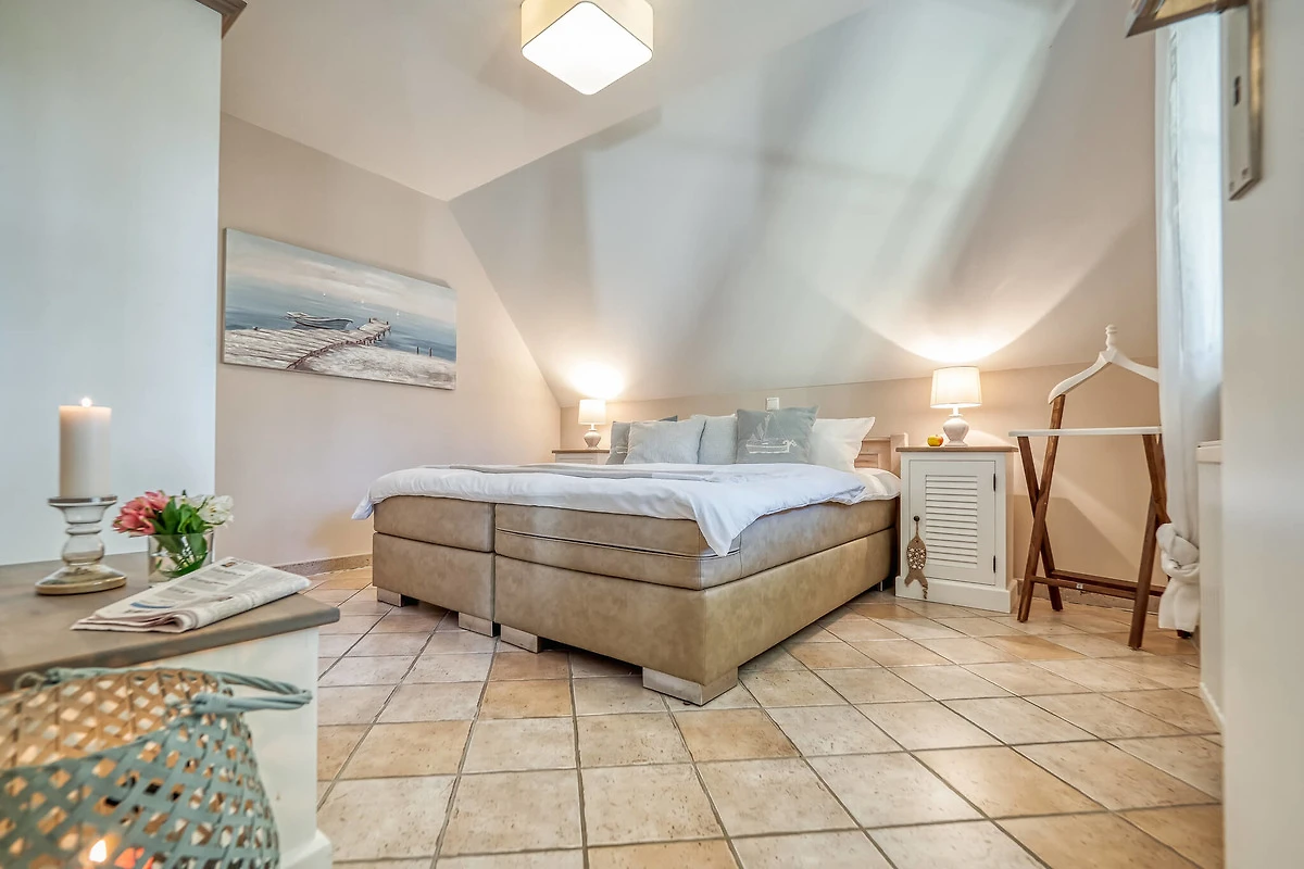 Im Obergeschoss finden Sie das helle und in modernem maritimem Stil eingerichtete Wohnzimmer. Eine gemütliche Couchecke mit Sessel und Sat-TV laden zum Ausruhen nach einem erlebnisreichen Tag auf dem Darss ein. Mit SAT-TV, Radio, CD, Bluetooth und WLAN ist die Wohnung technisch an die heutige Zeit angepasst.