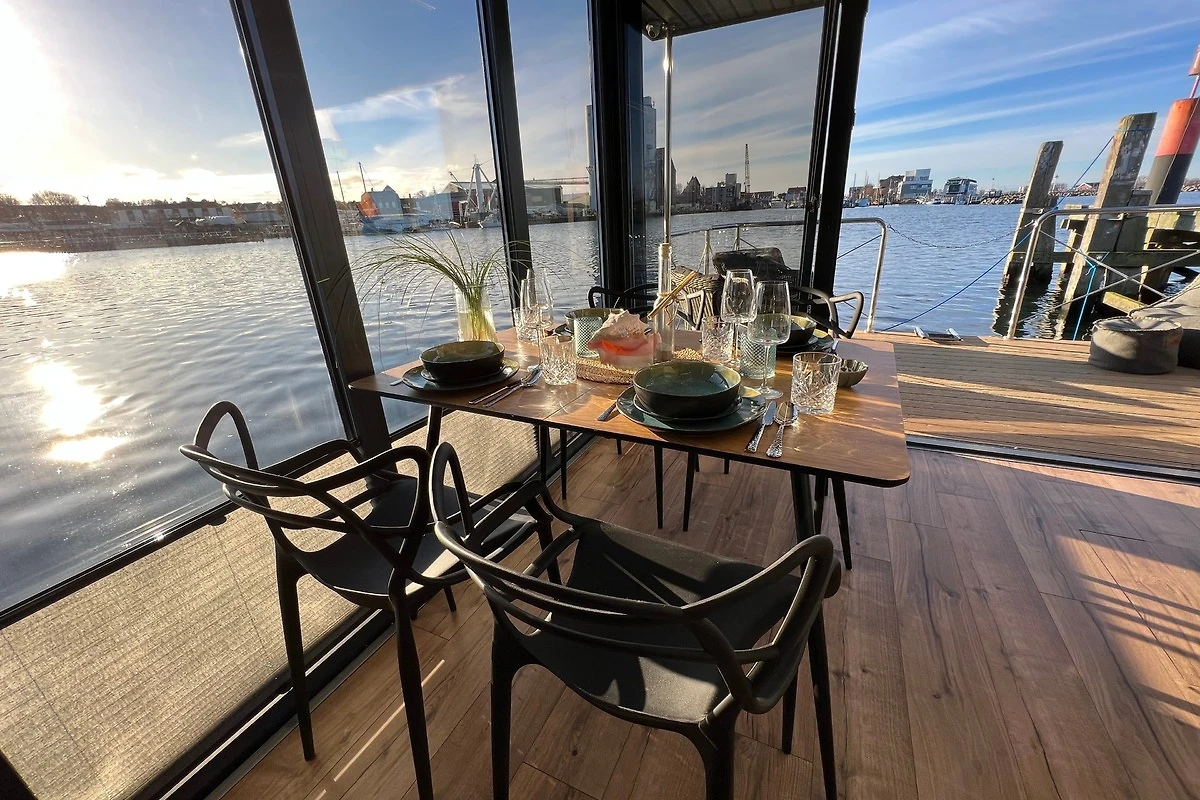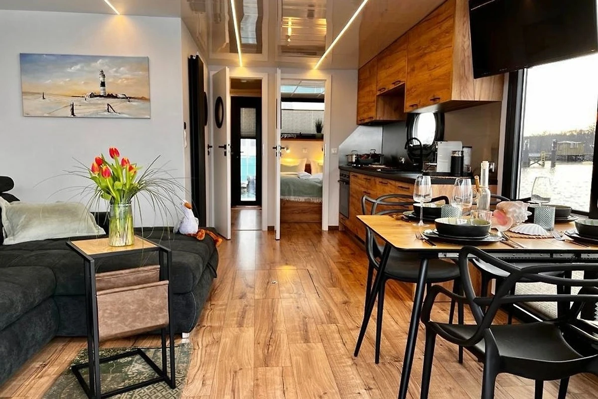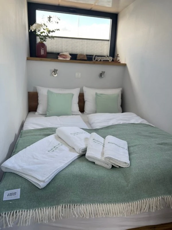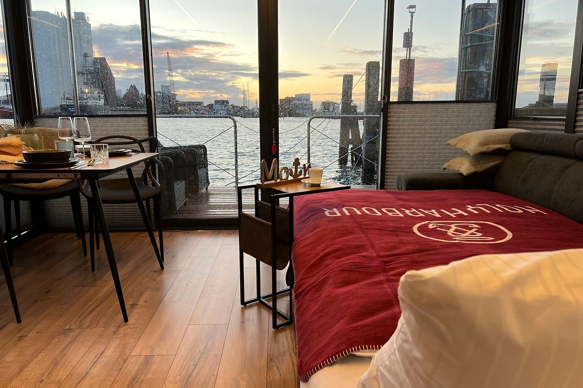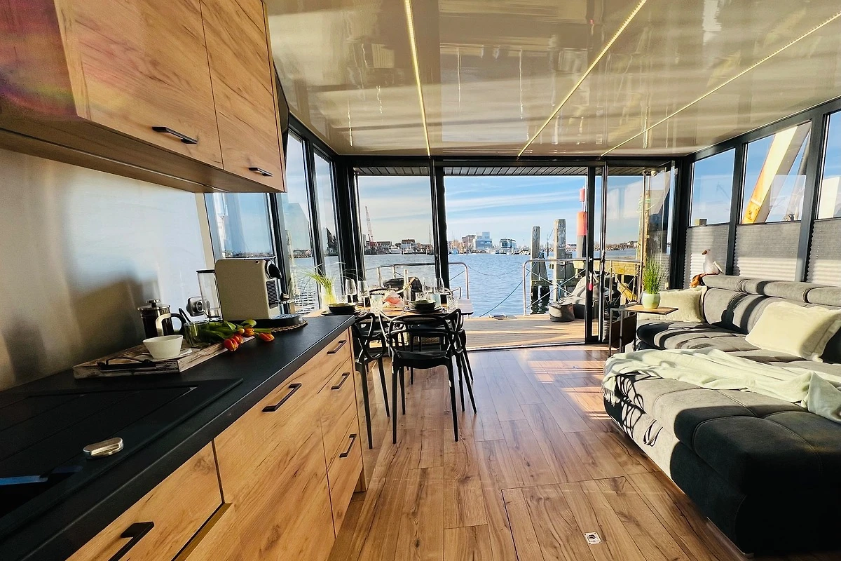Im Inneren des nagelneuen Haubootes "Mountainstreet29" fehlt es Euch an Nichts! Es ist ausgestattet wie ein hochwertiges Ferienhaus. Mit hauseigener Bettwäsche und flauschigen Handtüchern. Unsere Betten sind aus hochwertigen Materialien zum Wohlfühlen auch für Allergiker geeignet. Die ersten Cups für die an Bord befindliche Nespresso-Kaffeemaschine und das Starter-Kit fürs Verbrauchsmaterial sind für Euch bei uns inklusive! Für ein sofortiges Wohlfühlen nach eurer Anreise findet ihr im Kühlschrank einen ersten Willkommens-Sundowner. Das grosse Roof-Deck des schwimmenden Ferienhauses lädt zum Sonnenbaden ein. Geniesst den Ausblick auf das Hafenflair und das Meer, über die Halbinsel Steinwarder hinweg.
