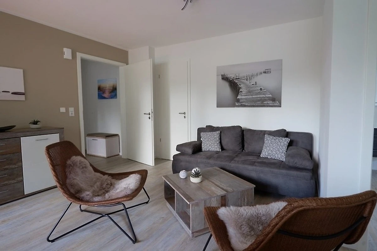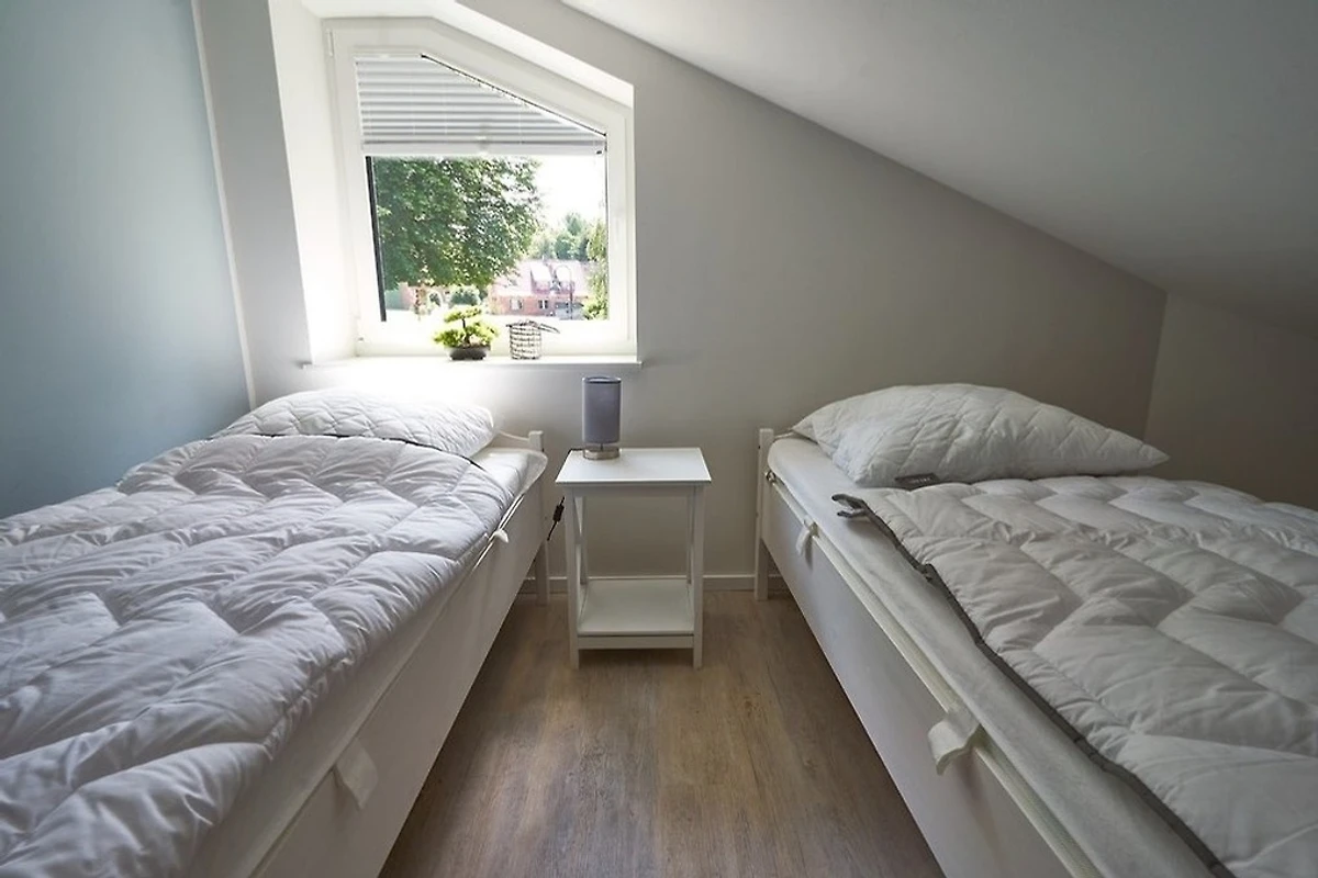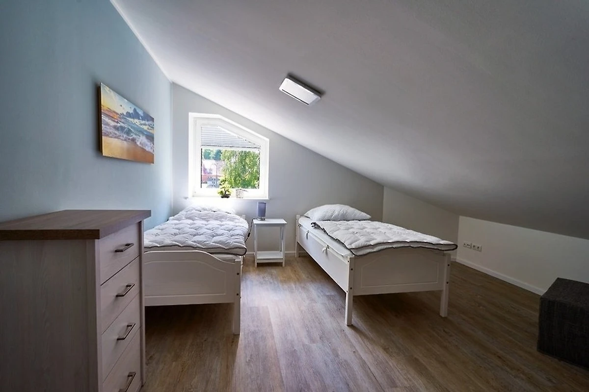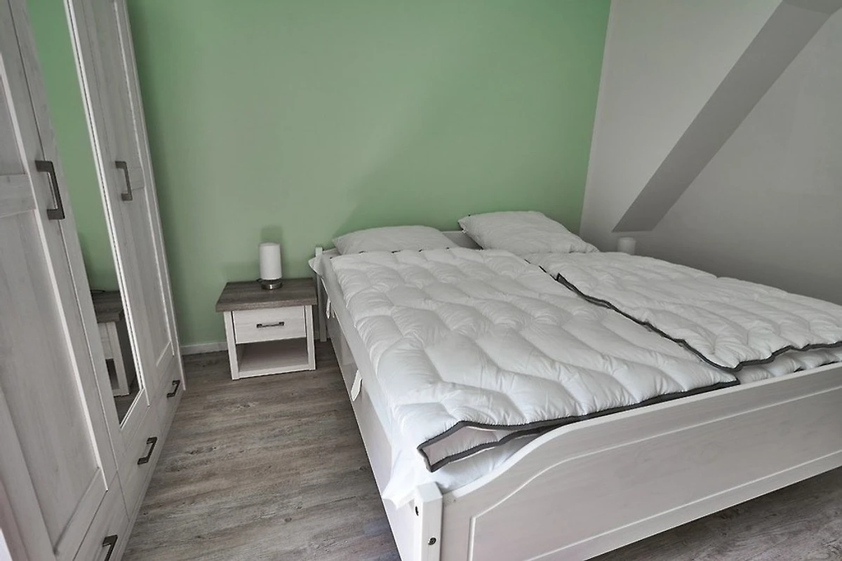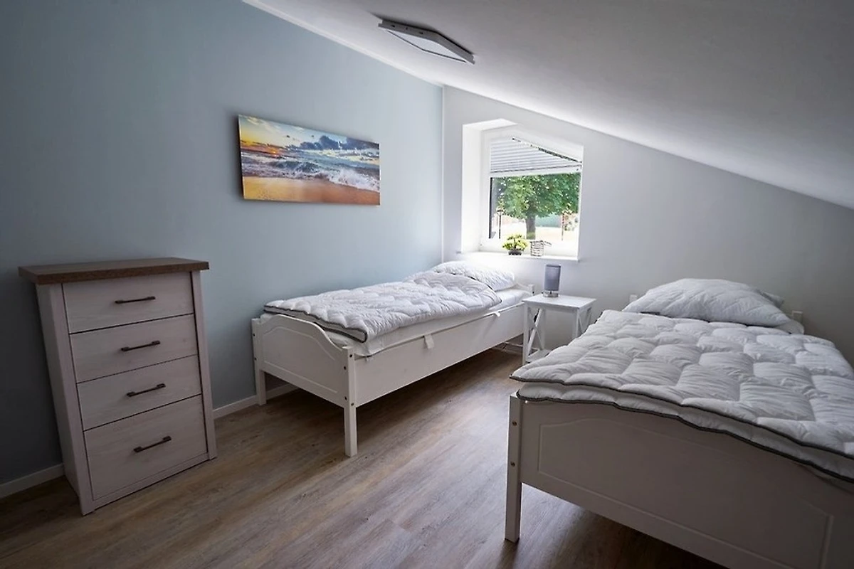 Ein Schlafzimmer mit einem 1.80 m breitem Doppelbett, eins mit zwei Einzelbetten, Wohnzimmer mit Ausziehcouch.