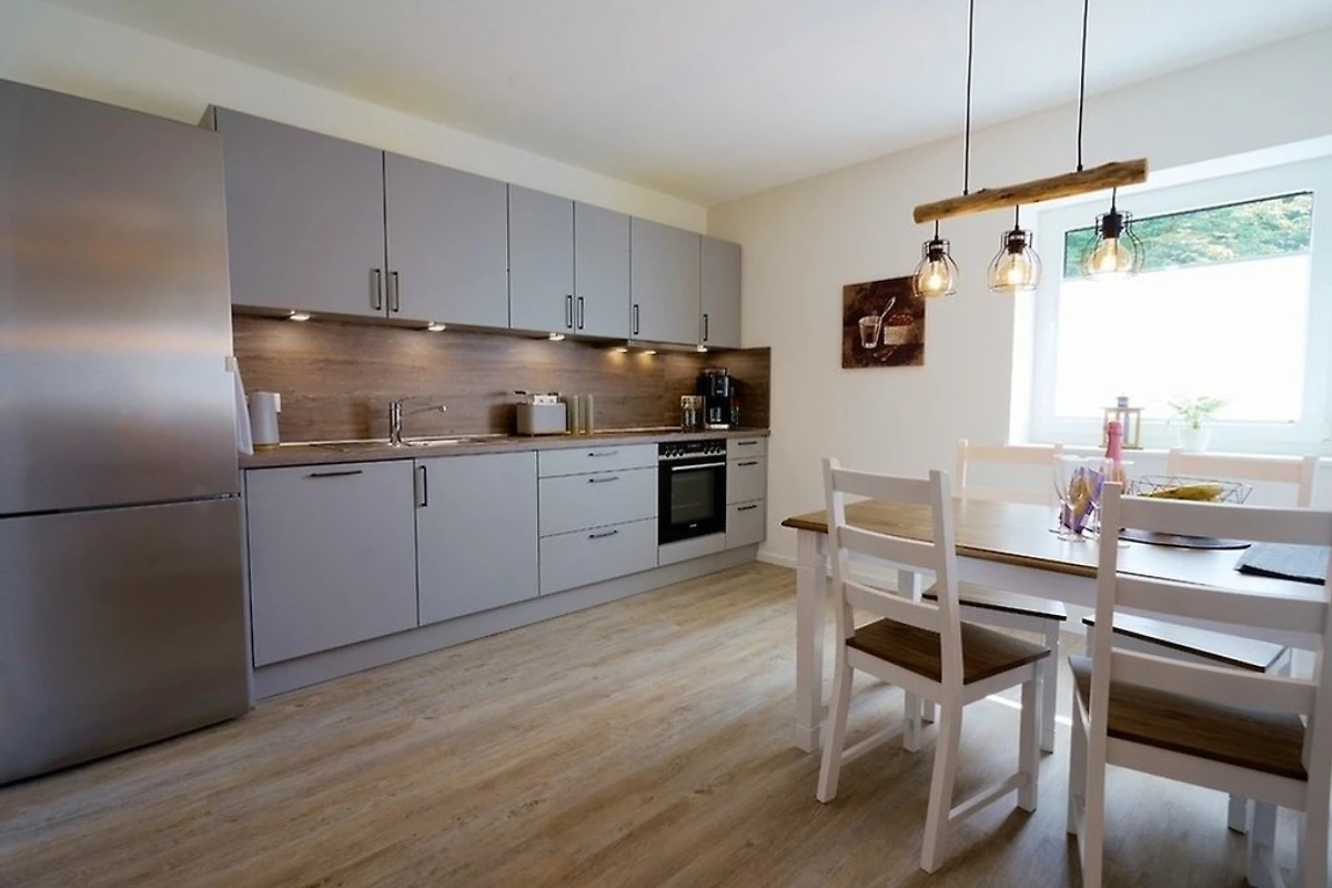 Gut ausgestattete Küche mit Wohn-und Essbereich.