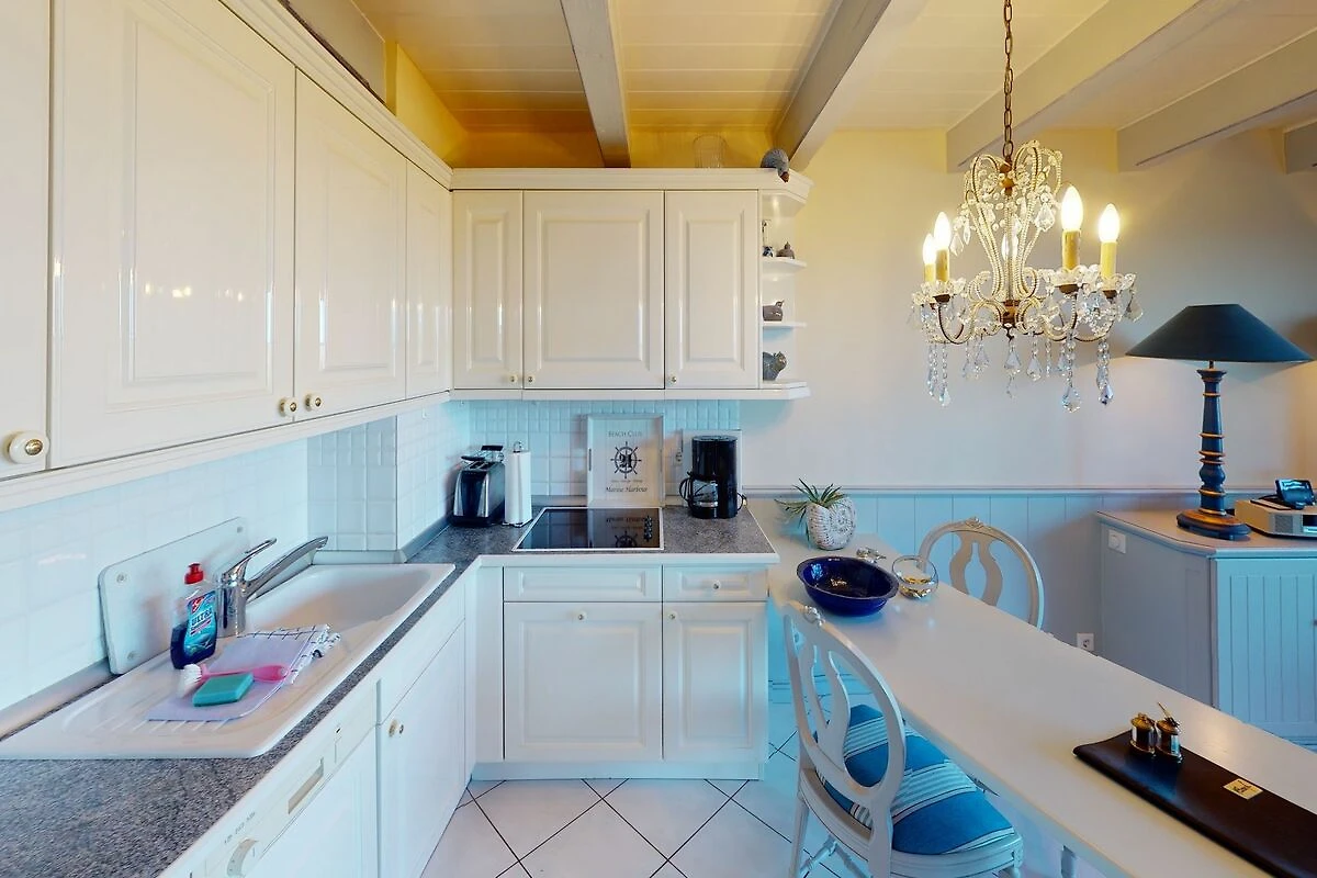 Im Erdgeschoss erwartet Sie ein geschmackvoll maritim gestalteter Wohnbereich mit einer gemütlichen Sofaecke, einer integrierten Küchenzeile und einem einladenden Essbereich. Durch die hellen Fensterfronten gelangen Sie direkt auf die großzügige Terrasse mit einem kleinen, angrenzenden Gartenteil. Hier können Sie im eigenen Strandkorb die traumhafte Aussicht auf die Salzwiesen und das Morsumer Wattenmeer in vollen Zügen genießen.