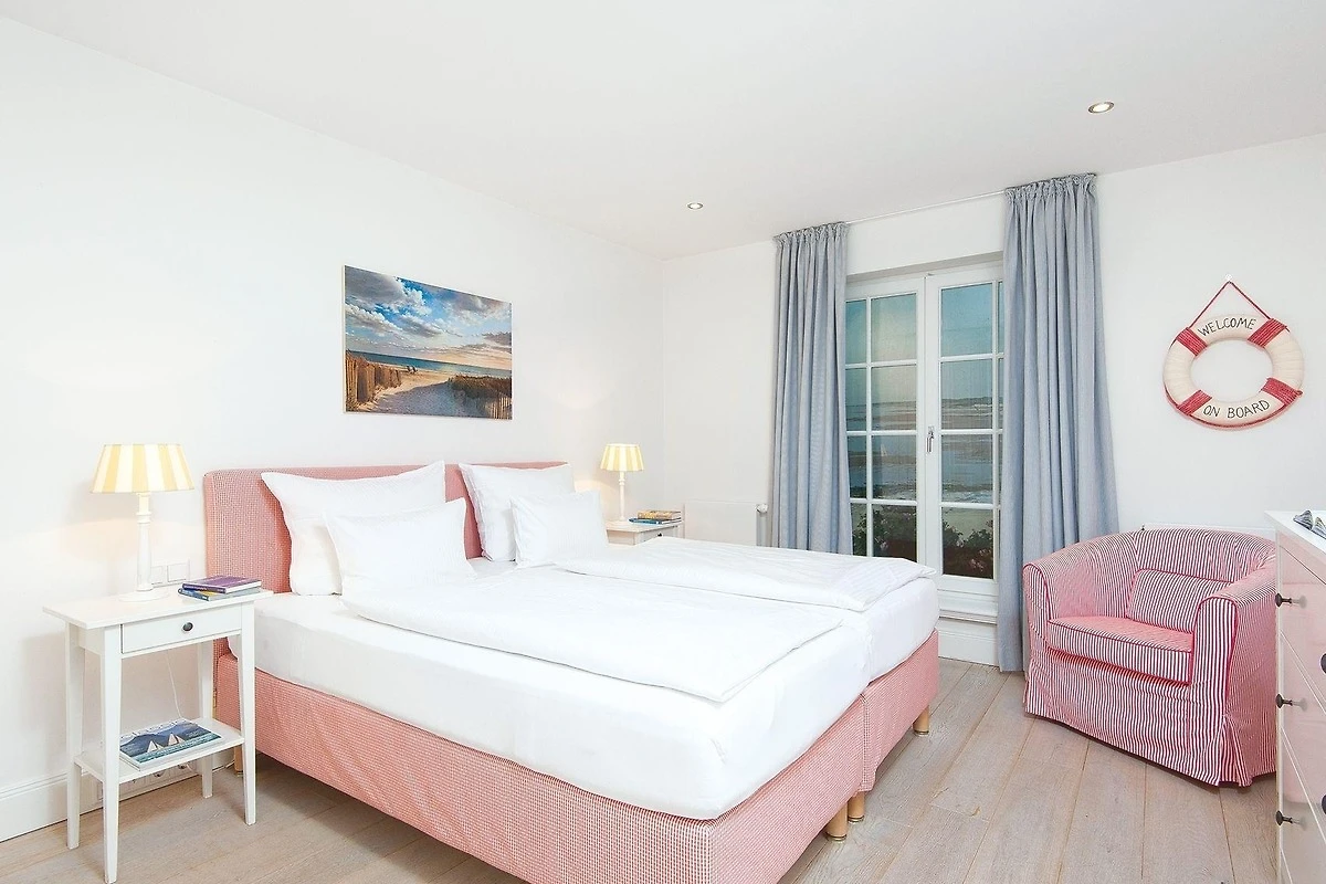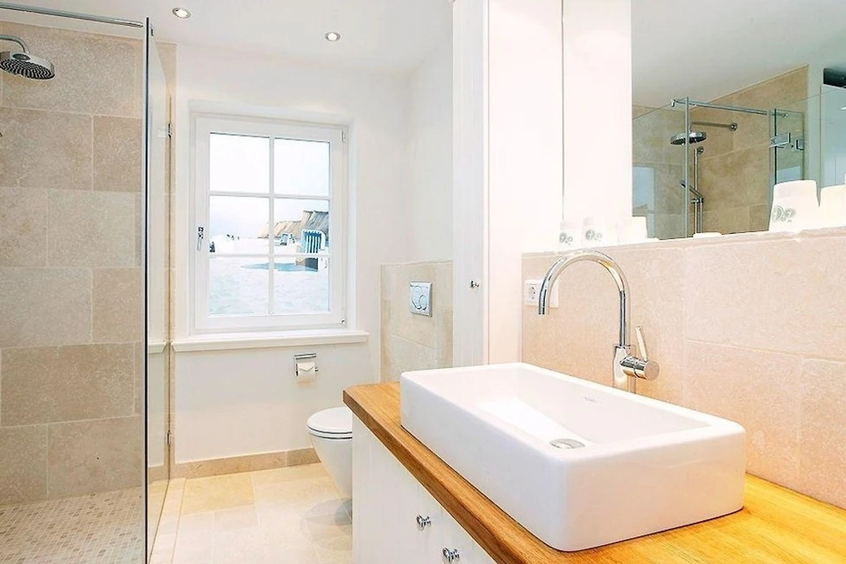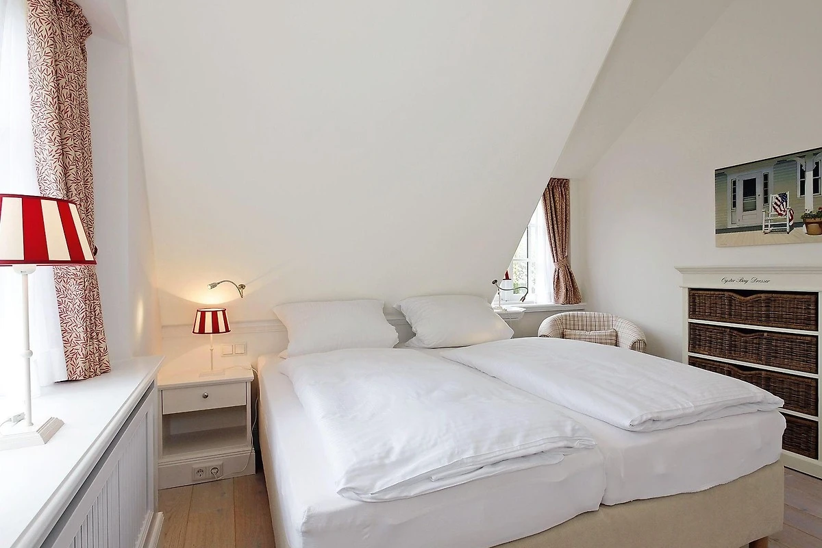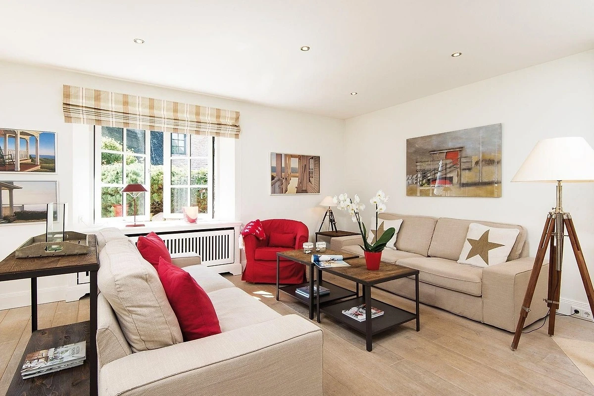 Diese Haushälfte mit Einzelhauscharakter liegt zentral an der Hauptstrasse, erreichbar über einen romantisch eingewachsenen Stichweg. Landhausflair trifft Farbakzent, das ist hier Programm. Ein luftiges Entrée samt Gäste-WC begrüsst Sie auf dem Weg in den offenen WohnEssbereich mit Kamin, bequemen Sofas und gleich zwei Terrassentüren. Eine geht nach Osten, wo man den ersten Kaffee auf der Bank in der Morgensonne geniessen kann und die zweite gen Süden mit hübsch angelegter Terrasse und Essplatz. Im Obergeschoss erwartet Sie ein kleiner Arbeitsplatz auf der Galerie, sowie ein verwunschen winkeliges Doppelschlafzimmer mit grossem Einbauschrank und Wannenbad en suite. Ebenso auf dieser Ebene, ein weiteres Einzelschlafzimmer mit Duschbad en suite. Im Untergeschoss gibt es gleich zwei hübsche Doppelschlafzimmer, viel Stauraum in den Einbauschränken und ein geräumiges Duschbad. Der Clou auf dieser Etage ist die Dampfsauna, entspanntes Syltfeeling ist also bei jedem Wetter garantiert. Das ganze Haus ist in hellen Farbt