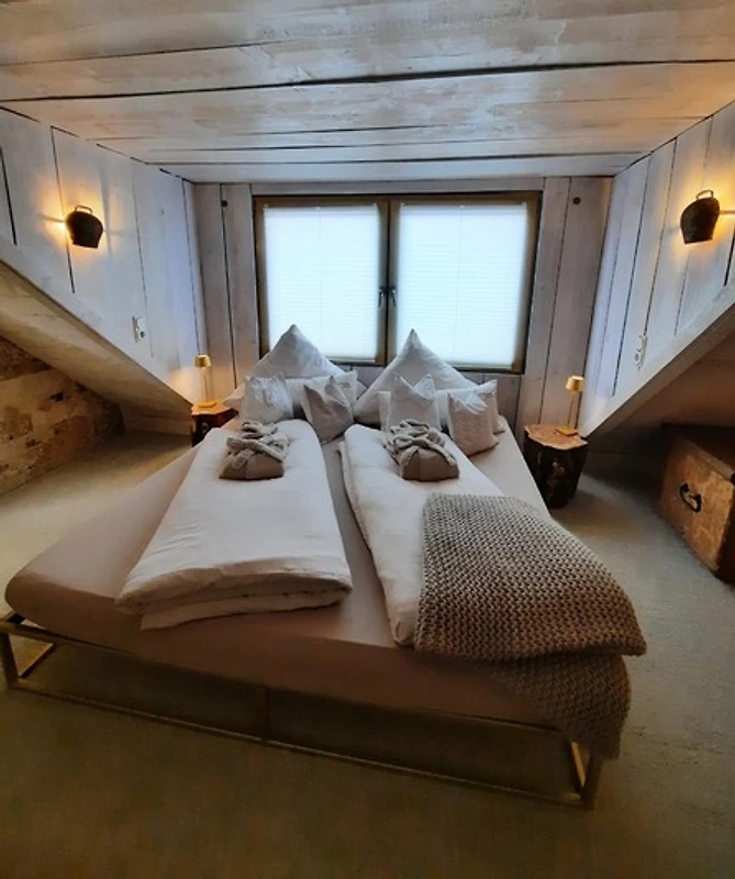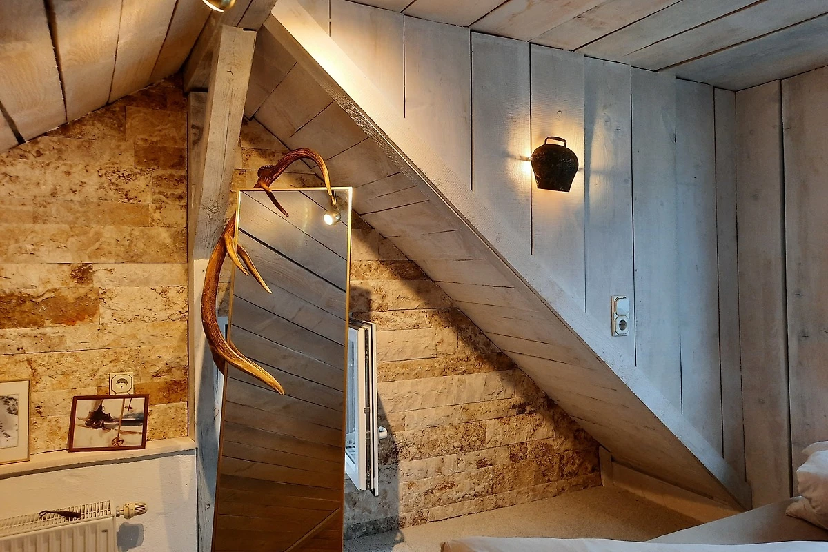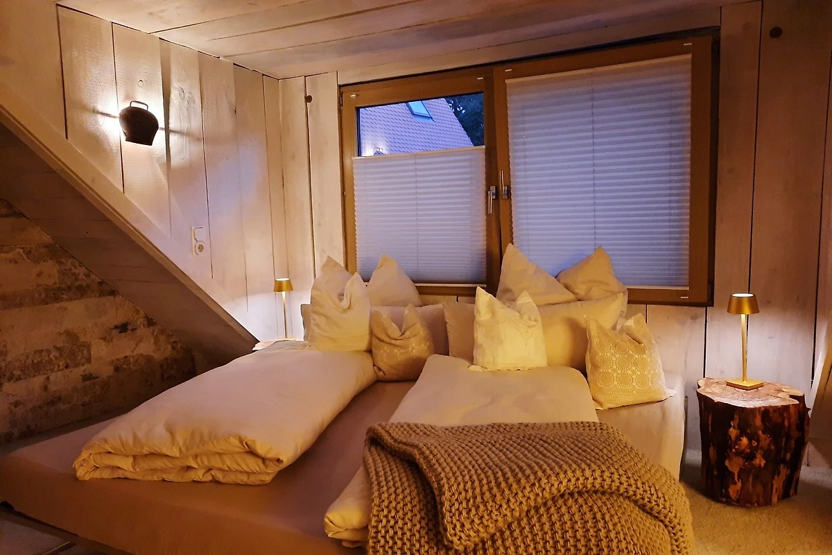 Der Zugang zum Schlafzimmer führt über eine Wendeltreppe (etwas steil/und etwas schmäler) und das Doppelbett steht auf einem Podest (ca. 25cm hoch) > dies gilt zu beachten!