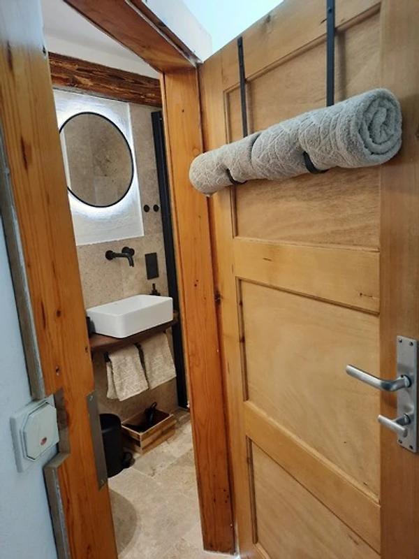 Da findst u.a. a begehbare Dusch, Hygieneartikel, Hand- und Badtücher, en Fön und sogar en Bademantel in den di nach em Duschen einkuscheln kannst.