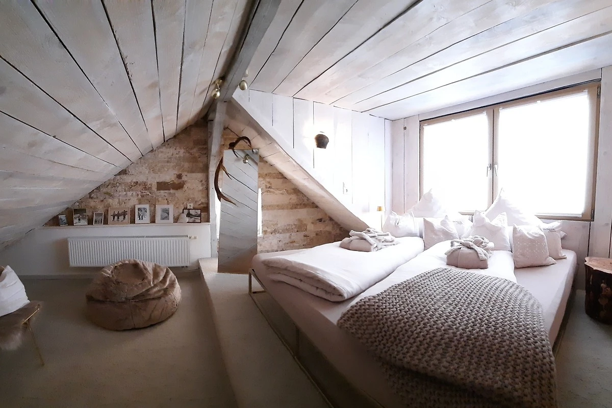 Mei absoluter Knaller is, wie i find, mei Schlaf- und Chillbereich, der sich in meim "Oberstüberl" befindet und über a Wendeltreppe "erklomma" werde kann.