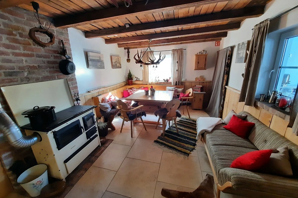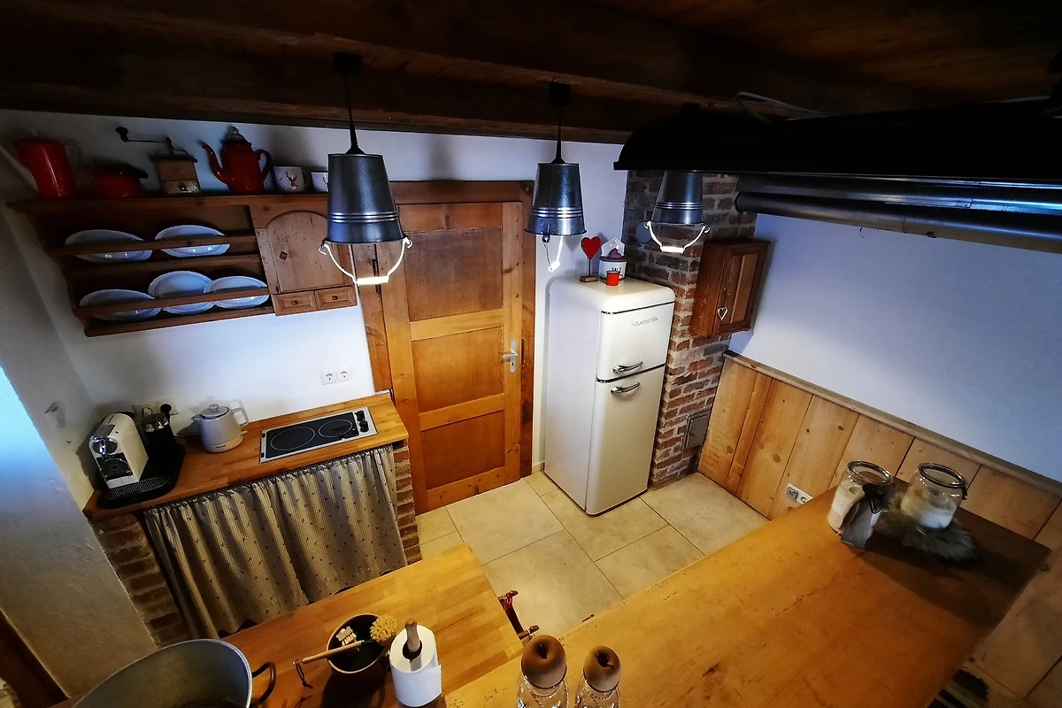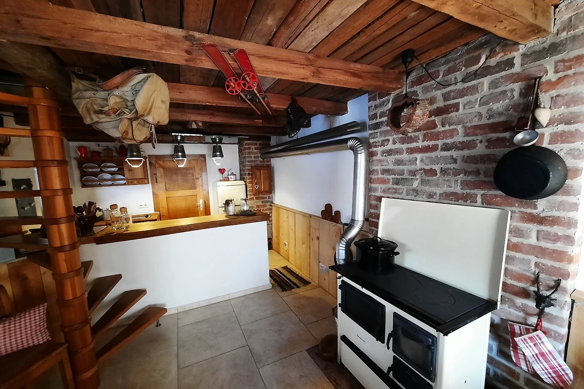 en gmütlichen Wohn-Essbereich mit Holzofen zum heizen und wenn'd magst au zum kochen, sowie a kleins, offenes und zuckersüsses Kücher'l des mit allem ausgstattet ist was mer für en angnehma Ferienaufenthalt braucht.