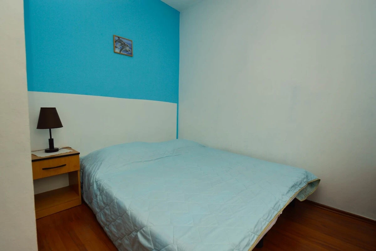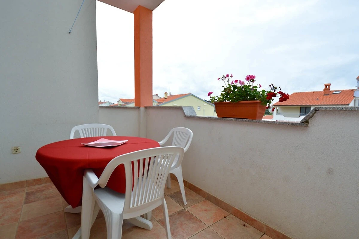 und führt über eine Aussentreppe direkt in den Flur. Wohn/Schlafzimmer mit 1 Zusatzbett auf Couch/Sofa, TV, Essecke und Zugang zum Balkon (7 qm, Gartenmöbel). 2 Schlafzimmer jeweils mit 1 Doppelbett. Kochecke im Wohn/Schlafzimmer mit Gasherd (2 Flammen), Elektroherd (2 Platten), Backofen, Kühlschrank, Mikrowelle, Kaffeemaschine, Toaster und elektrischem Wasserkocher. Bad mit Waschmaschine, Dusche und WC.