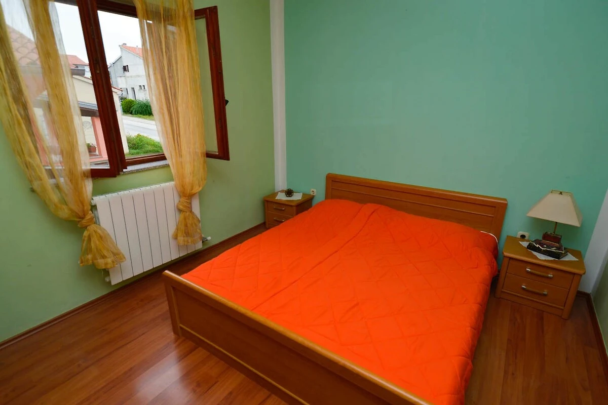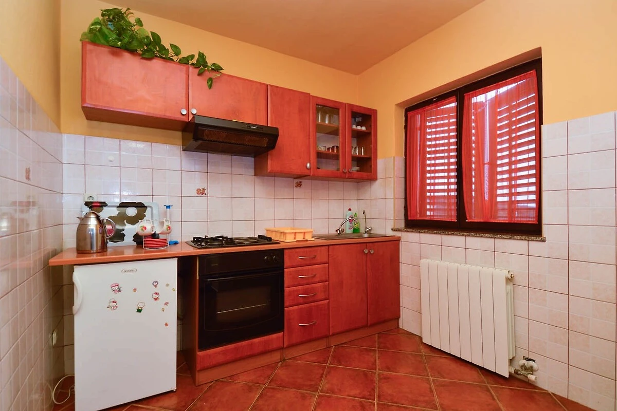 Pula, Ortsteil Veruda Porat. Die Ferienwohnung befindet sich auf einem offenen Grundstück mit Bäumen. Der Vermieter wohnt nicht im Haus oder auf dem Grundstück. Die Zufahrt erfolgt über eine Nebenstrasse (asphaltiert). Parkplatz auf der Strasse vor dem Haus.