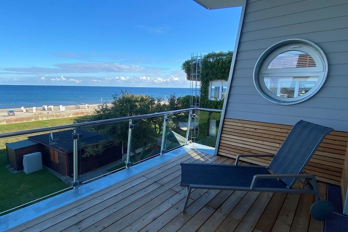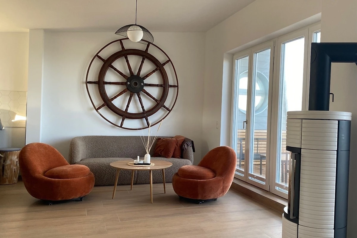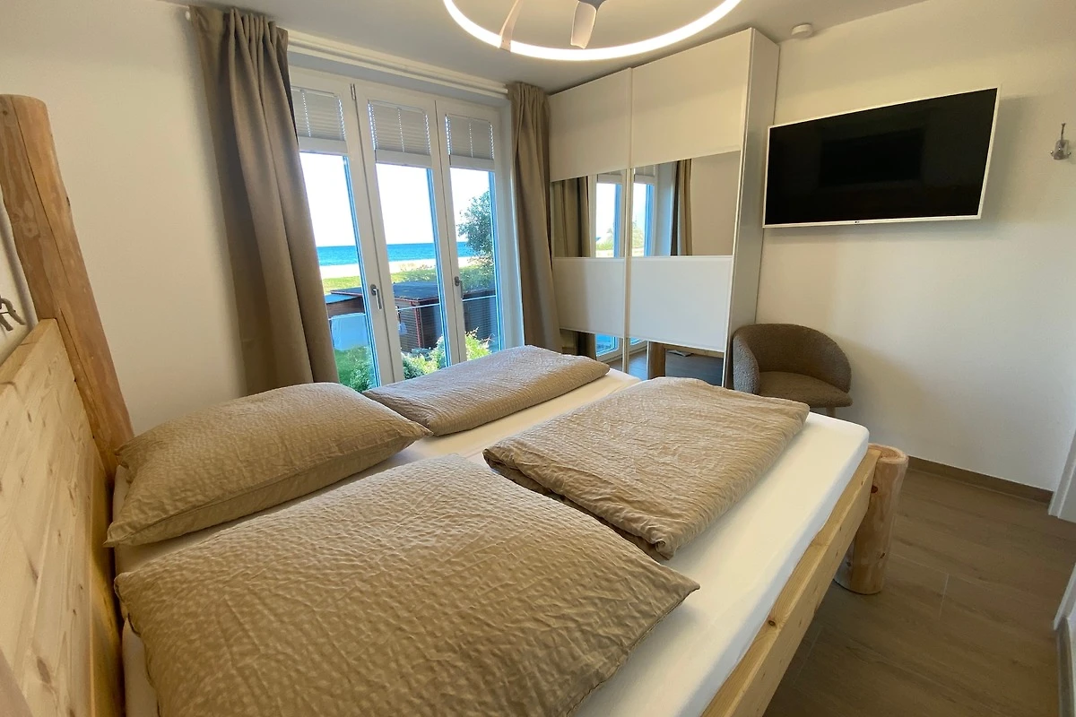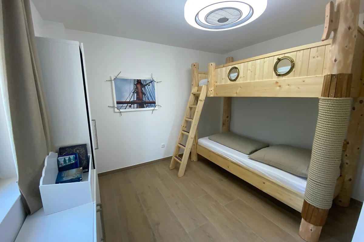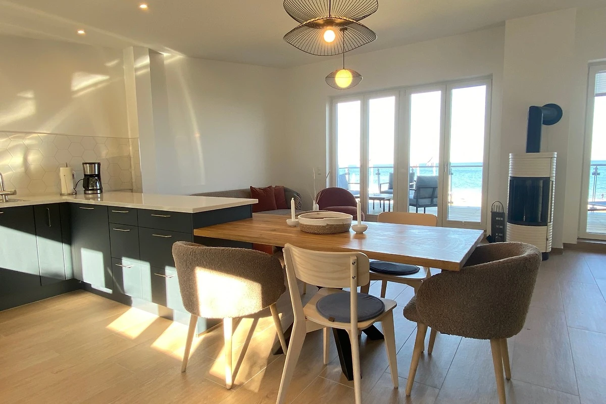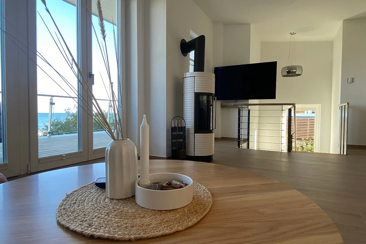Die Wohnung besticht durch das maritime und moderne Design. Im ersten Stock befinden sich die drei Schlafzimmer und bieten 5 Personen platz, zwei Schlafzimmer haben ein Doppelbett von 180 x 200 cm. Das Kinderschlafzimmer hat ein Etagenbett mit den Massen 90 x 200 cm, im unteren Bett wartet auf die Kleinsten ein Sternenhimmel. Ausserdem befinden sich auf der Etage zwei Badezimmer. In einem haben haben Sie eine ebenerdige Dusche, zwei Waschbecken und eine Badewanne mit Meerblick. Das zweite Badezimmer hat ebenfalls eine Dusche, ein Waschbecken und ein WC. Im zweiten Stock befindet sich ausserdem ein Gäste-WC und ein grosszügiger Wohnbereich mit Essplatz und offener gestalteten Küche. Für die kältere Jahreszeit haben Sie ein Kamin. Die Fensterfront zum Meer bietet Ihnen einen unglaublichen Blick über die Ostsee und einen direkten Zugang zum Balkon.