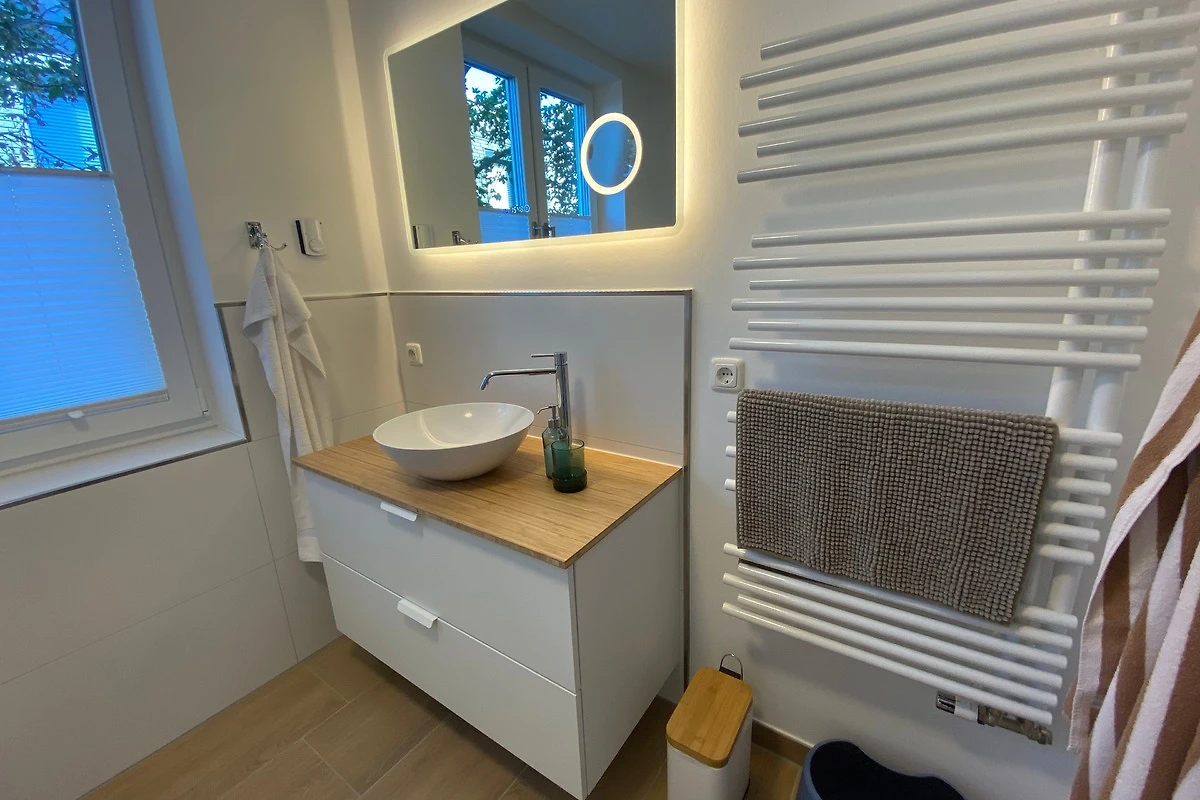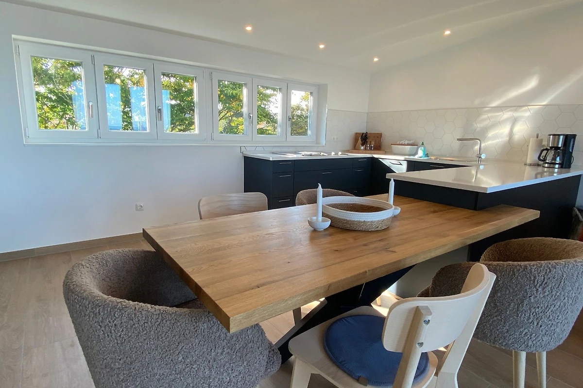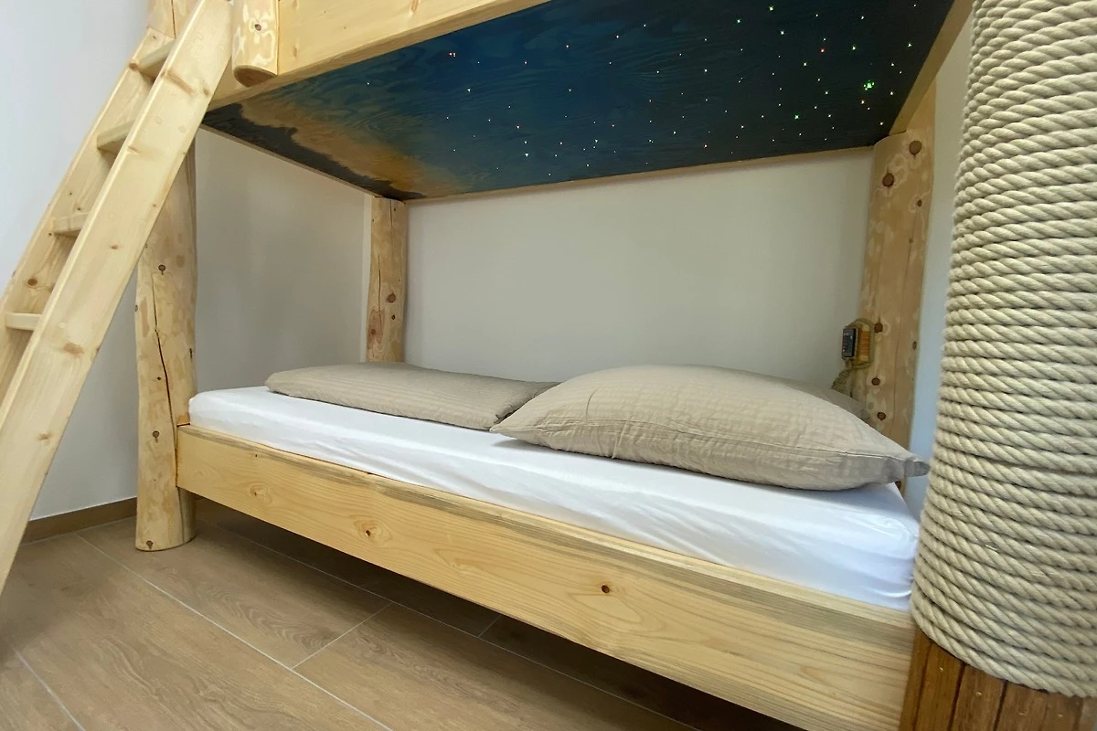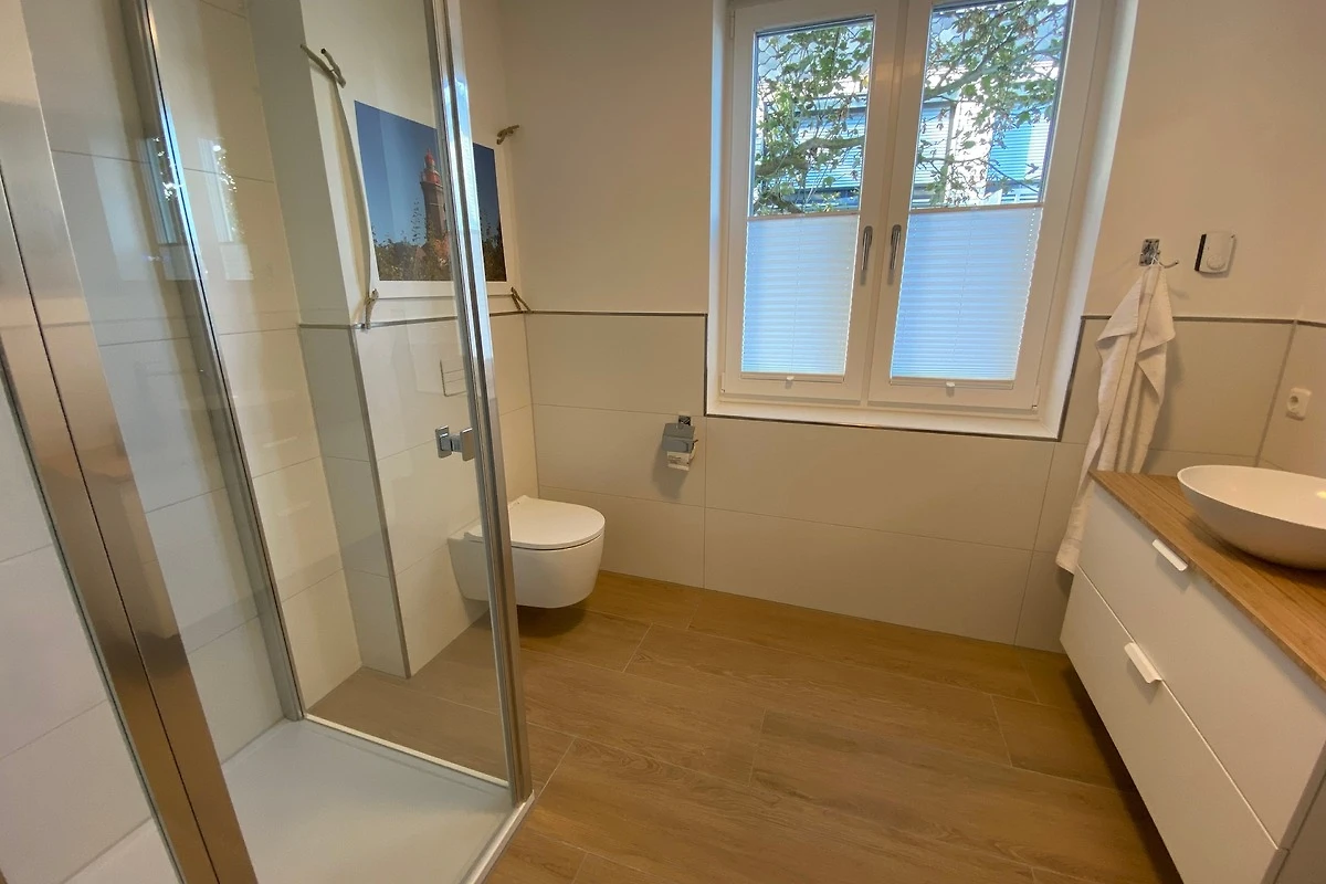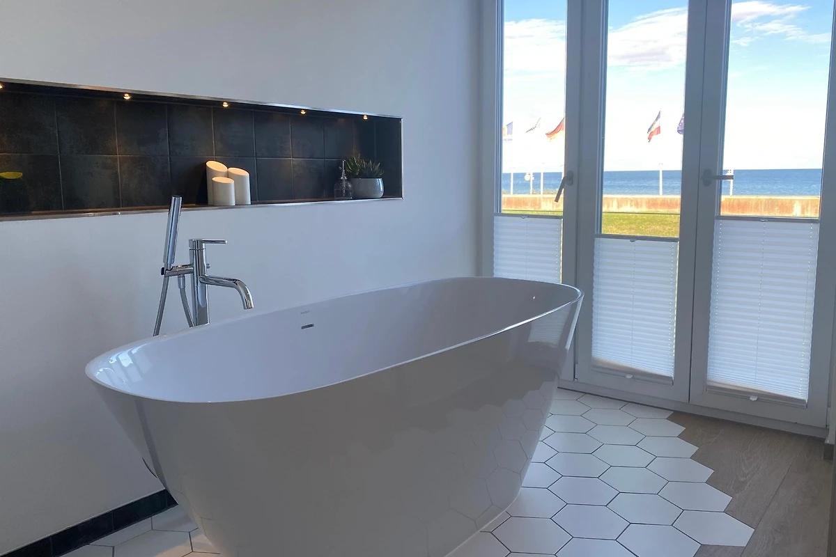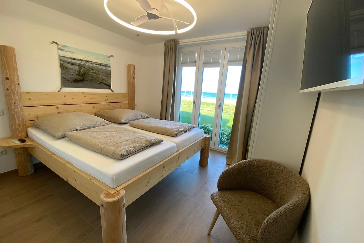Die Wohnung besticht durch das maritime und moderne Design. Im ersten Stock befinden sich die drei Schlafzimmer und bieten 5 Personen platz, zwei Schlafzimmer haben ein Doppelbett von 180 x 200 cm. Das Kinderschlafzimmer hat ein Etagenbett mit den Massen 90 x 200 cm, im unteren Bett wartet auf die Kleinsten ein Sternenhimmel. Ausserdem befinden sich auf der Etage zwei Badezimmer. In einem haben haben Sie eine ebenerdige Dusche, zwei Waschbecken und eine Badewanne mit Meerblick. Das zweite Badezimmer hat ebenfalls eine Dusche, ein Waschbecken und ein WC. Im zweiten Stock befindet sich ausserdem ein Gäste-WC und ein grosszügiger Wohnbereich mit Essplatz und offener gestalteten Küche. Für die kältere Jahreszeit haben Sie ein Kamin. Die Fensterfront zum Meer bietet Ihnen einen unglaublichen Blick über die Ostsee und einen direkten Zugang zum Balkon.