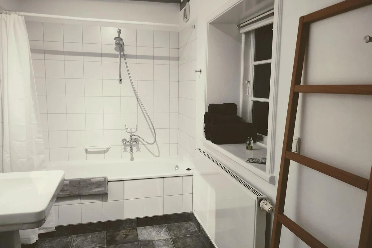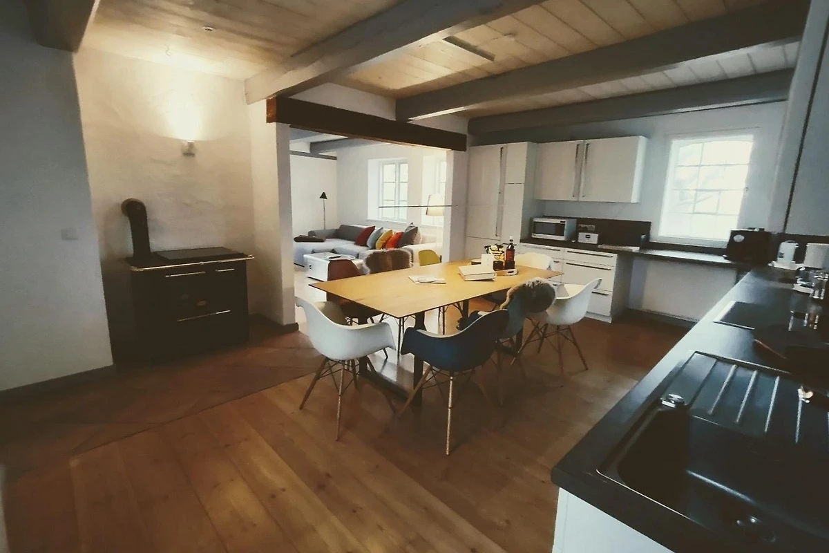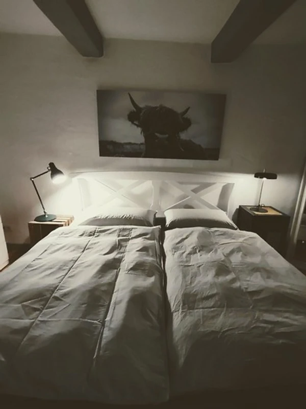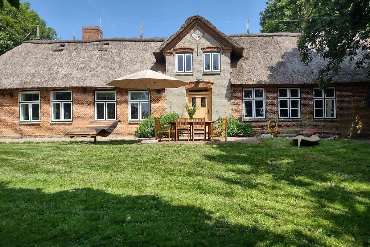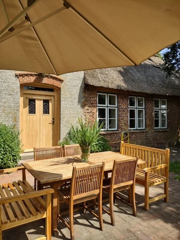 Moin!Im idyllischen Reetdachhaus EULENHOF 1843 können Sie fernab des Trubels entspannen und sind gleichzeitig nur 15 Minuten von dem beliebten Küstenort St. Peter-Ording entfernt.Das denkmalgeschützte Haus aus dem Jahr 1843 befindet sich in Poppenbüll auf der Halbinsel Eiderstedt und kann mit maximal 8 Personen, inkl. Kindern, bezogen werden. Nachdem Sie den hofeigenen Deich passiert haben, fahren Sie entlang einer grosszügigen Kieseinfahrt zum Haus, wo drei kostenfreie Parkplätze auf Sie warten. Durch das Tor gelangen Sie auf das weitläufige Grundstück (ca. 1.000 m²), das mit einem grossen Garten, Gartenstühlen, einem Tisch und der Himmelsliege Tegernsee ausgestattet ist, die Ihnen exklusiv zur Verfügung stehen. Eine Gartensauna lädt nach einem langen Spaziergang zum Entspannen ein und bietet wohltuende Wärme und Gemütlichkeit.Nachdem Sie durch die Haustür eingetreten sind, führt der Flur zu einem ersten Bad, zum ersten Schlafzimmer und zum Zimmer mit Etagenbett und Babybett, alternativ kann man hier nachdem Saunabesuch entspannen. Angrenzend daran befindet sich ein weiteres Schlafzimmer, von dem aus Sie einen herrlichen Blick auf den Stall-Garten geniessen können. Auch der Zugang zum zweiten Bad (mit Badewanne) befindet sich hier. Vom Flur aus gelangen Sie weiterhin in das gemütliche Dachgeschoss, wo sich das dritte Badezimmer und das vierte Schlafzimmer befinden, eine gemütliche Leseecke lädt hier zum Verweilen ein. Das Wohnzimmer, das an die offene Küche mit Essbereich grenzt, ist der zentrale Treffpunkt für alle. Ihre Urlaubswäsche können Sie im eigenen Waschraum mit Waschmaschine und Trockner erledigen. Hier stehen Ihnen auch ein Staubsauger, Besen, Wischmopp, Bügelbrett- und eisen und eine Wäschespinne zur Verfügung. Zusätzlich haben Sie hier die Möglichkeit, über eine zweite Haustür direkt in den Garten zu gelangen oder das Haus zu betreten.Hinweis zur Barrierefreiheit:Das 180 Jahre alte Bauernhaus ist leider nicht barrierefrei oder behindertengerecht, u.a. aufgrund der Wege zum Haus, der Treppe zum Dachgeschoss, der Stufen an den Eingängen sowie der Türleisten, die teilweise einige Zentimeter über dem Boden stehen.3 Tiere sind gegen Aufpreis und mit Anmeldung möglich. Hunde sind auf dem gesamten Gelände bitte an der Leine zu führen.Im kostenlosen Wäschepaket sind jeweils ein kleines und ein grosses Handtuch pro Person enthalten. Ihre Saunahandtücher bringen Sie selbst mit oder können diese alternativ für 10 EUR pro Stück dazu buchen.Verpassen Sie nicht einen der schönsten Sonnenuntergänge Eiderstedts am Eulenhof.Wir wünschen Ihnen eine angenehme Zeit im Ferienhaus Eulenhof 1843 in Poppenbüll!