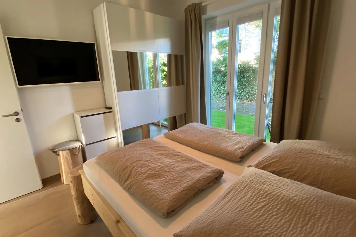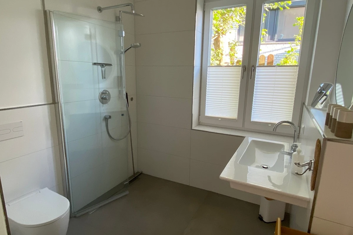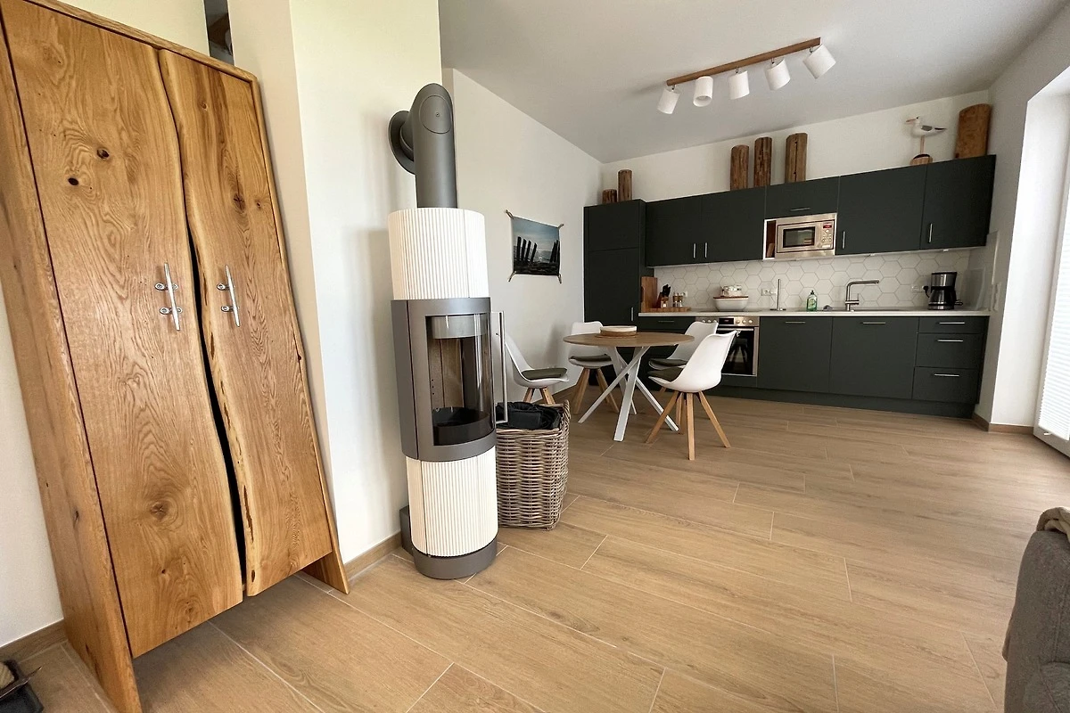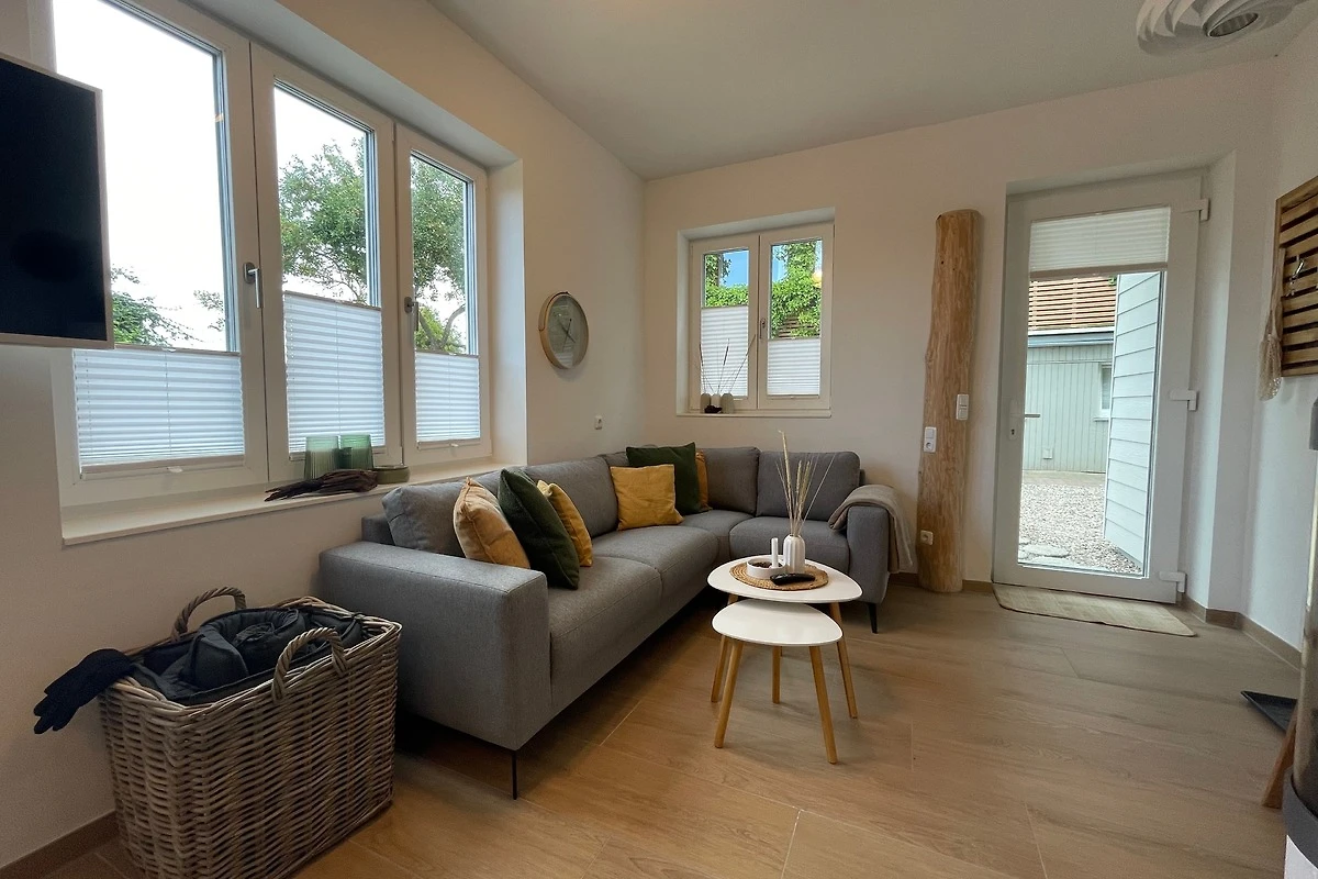 Der Eingangsbereich besticht durch einen offen gestalteten Koch-, Ess- und Wohnbereich, mit angrenzender Terrasse auf der Sie die Morgendsonne geniessen können, Ostseite. Die Wohnung ist für bis zu 4 Personen mit max. zwei Hunden ausgestattet und besticht durch das maritime und moderne Design. Die Wohnung bietet Ihnen zwei Schlafzimmer, das grössere hat ein Doppelbett von 180 x 200 cm und das kleinere ein Doppelbett von 160 x 200 cm. Von den Schlafzimmern aus gelangen Sie auf eine weitere Terrasse, Westseite, auf der Sie die Nachmittags- und Abendsonne geniessen können. Das Wohlfühlbadezimmer mit einer ebenerdigen Dusche lässt keine Wünsche offen. Für die Hunde ist der eingezäunte Aussenbereich rundums Haus ein Bereich zum entspannen und geniessen.