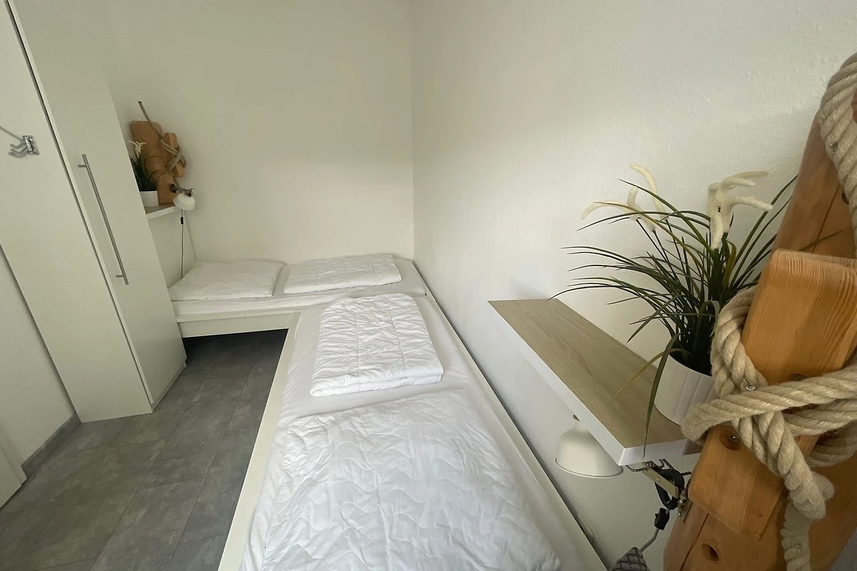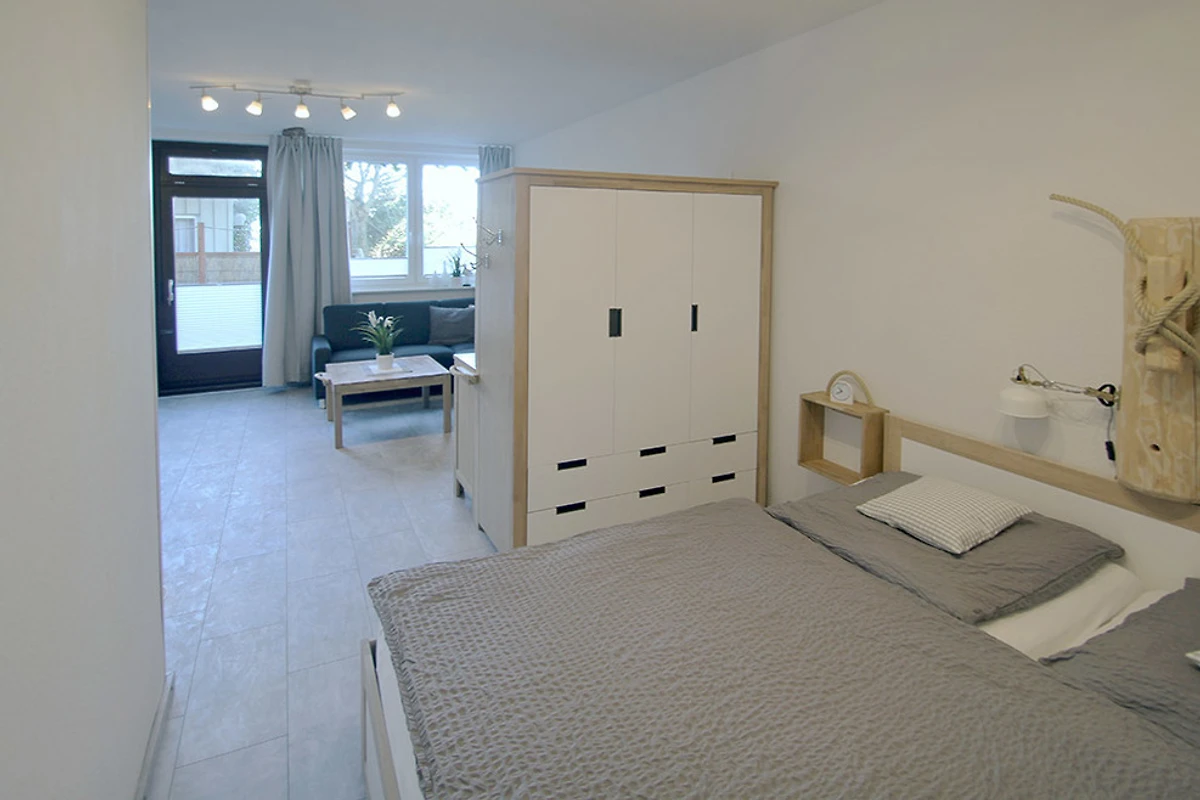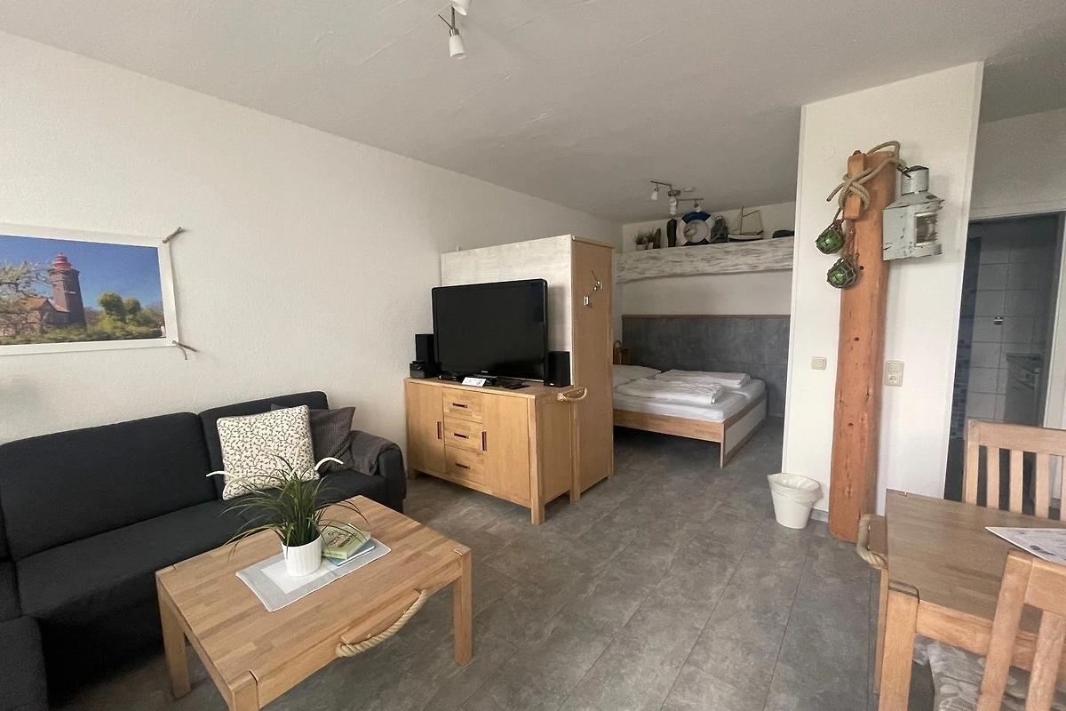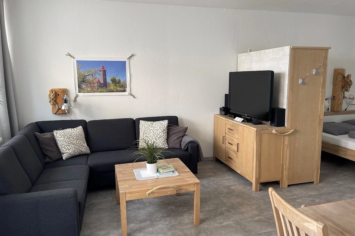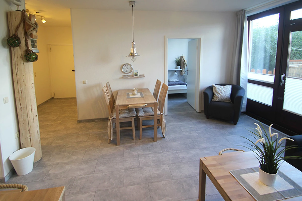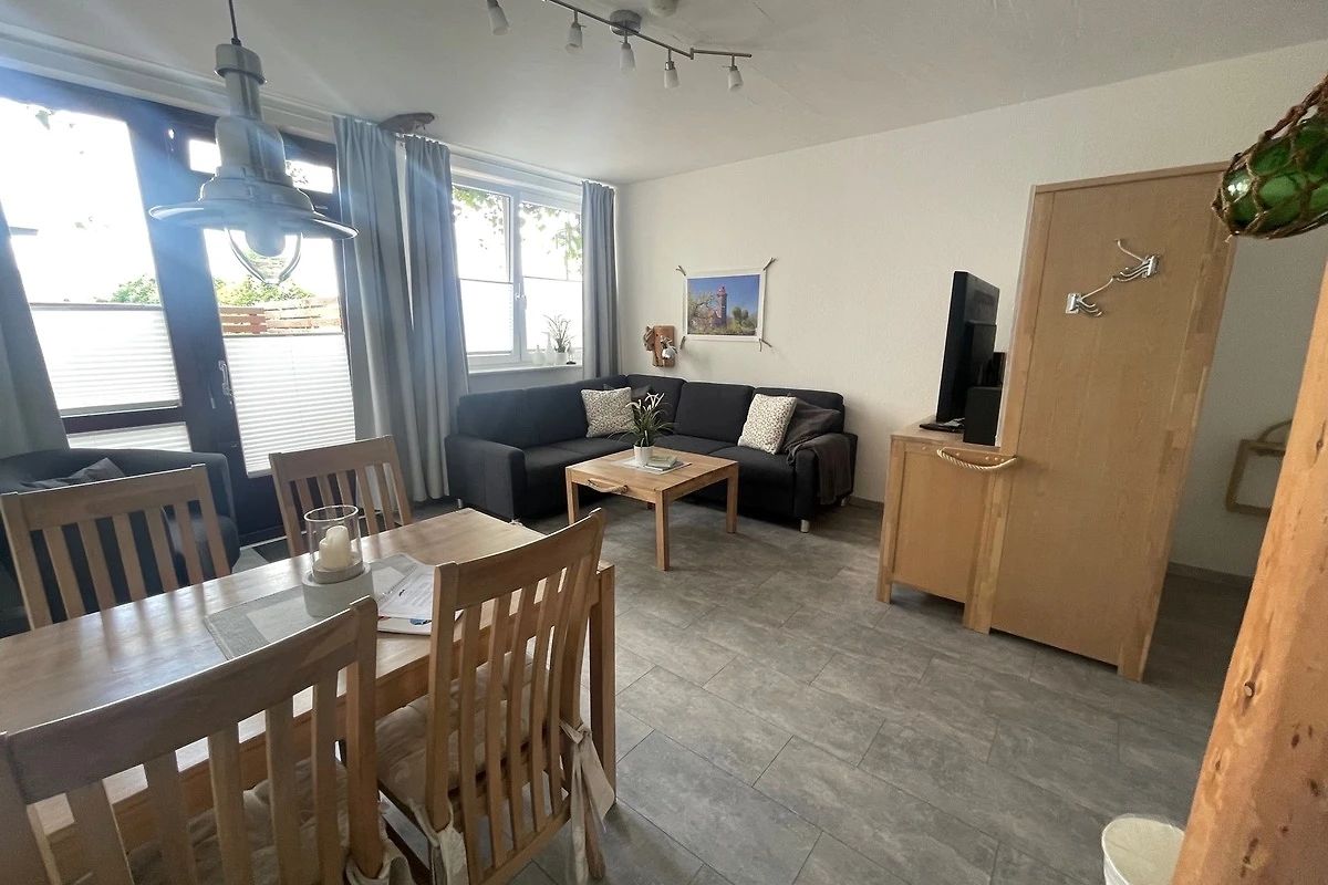 Die Ferienwohnung Seesand bietet Platz für 4 Personen auf 54 m² und liegt im Erdgeschoss des Hauses Panorama. Durch die Lage im Erdgeschoss ist die Wohnung auch für Menschen mit Gehbehinderung geeignet. Auf der im Grünen angelegten, grossen Terrasse können Sie den Abend gemütlich ausklingen lassen. Der grosse Wohnbereich mit Essecke und abgetrenntem Schlafbereich mit Doppelbett ist hell und freundlich eingerichtet. Des Weiteren bietet die Wohnung ein separates Schlafzimmer mit 2 Einzelbetten. Eine komplett eingerichtete Küche lässt kaum Wünsche offen. Das Badezimmer ist mit Dusche und WC ausgestattet. Ihr Hund ist hier ebenfalls ein gern gesehener Gast und der Hundestrand ist nur 2 Gehminuten entfernt von der Wohnung.