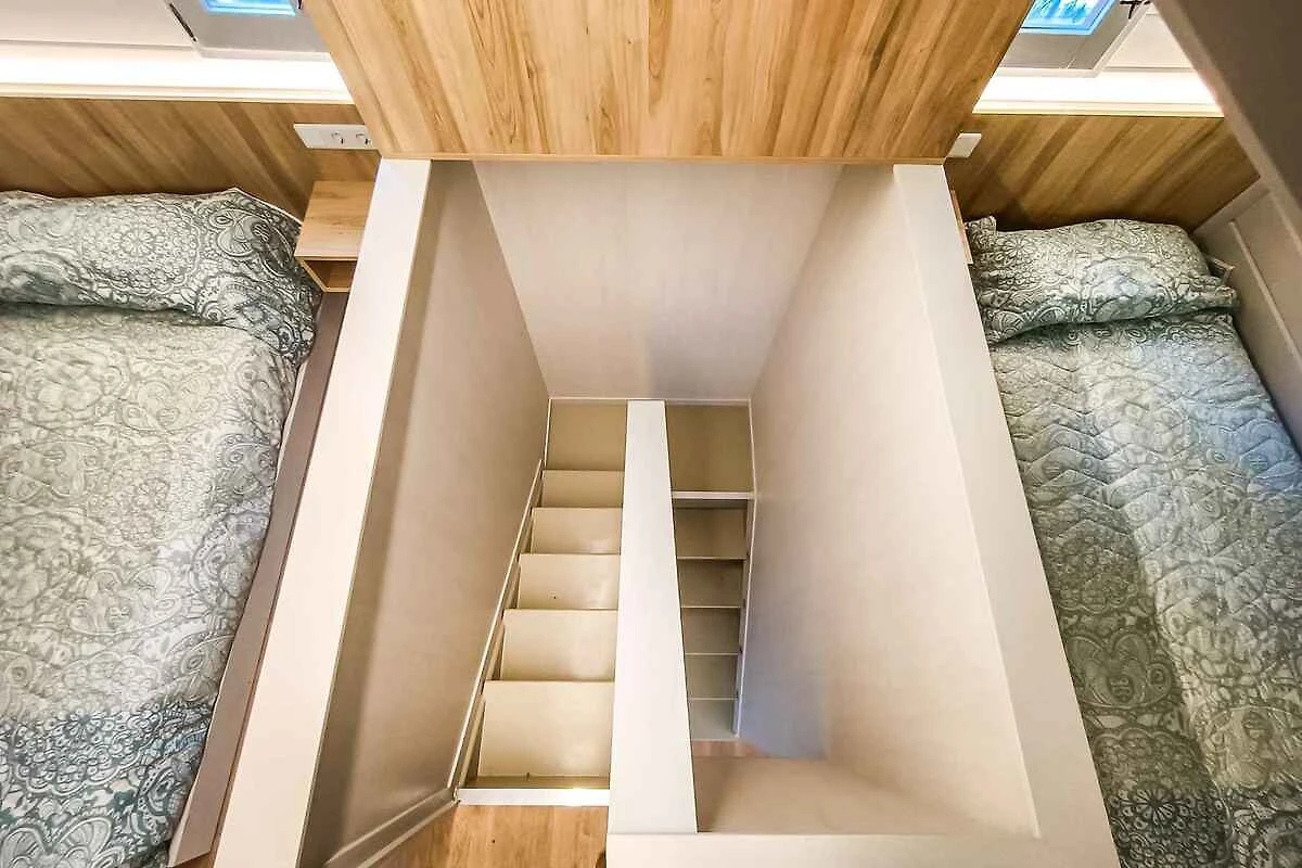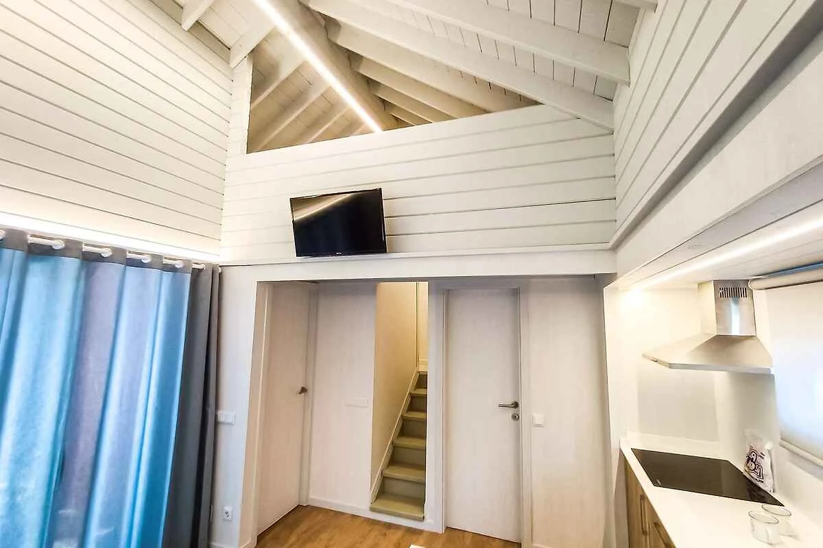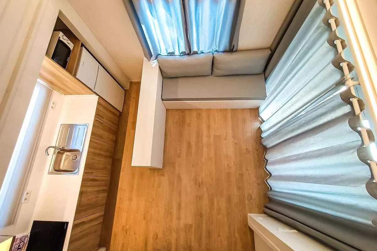 Erdgeschoss: Wohnzimmer (nicht beheizbar) mit TV und Essecke (5 Plätze). Schlafzimmer (nicht beheizbar) mit 1 Doppelbett und 1 Gitterbett. Kochnische mit Elektroherd, Kühlschrank, Mikrowelle und Kaffeemaschine. Bad mit Dusche und WC.