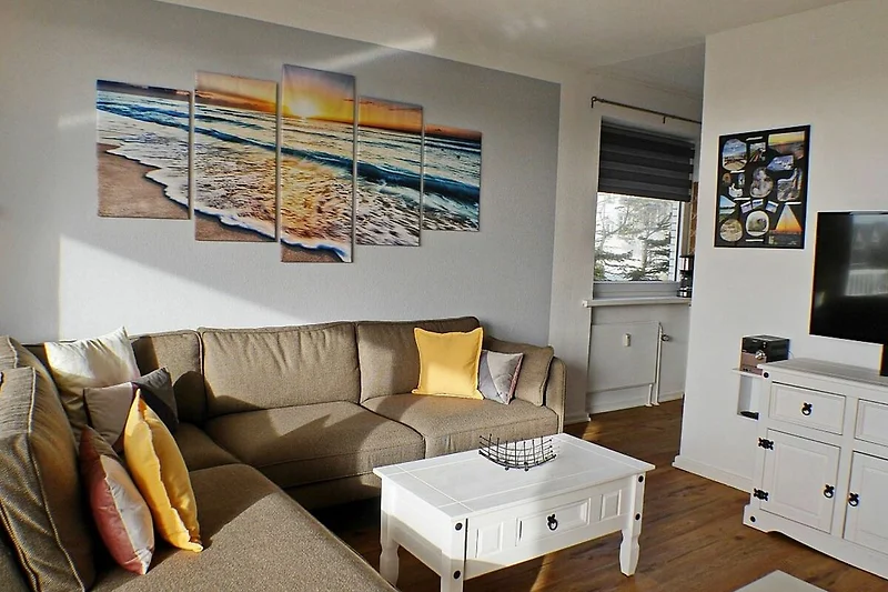 Ein helles Wohnzimmer mit Couch, Flachbild-TV und Essecke (ausziehbar aus dem Einbauschrank) ist der Mittelpunkt der Wohnung.