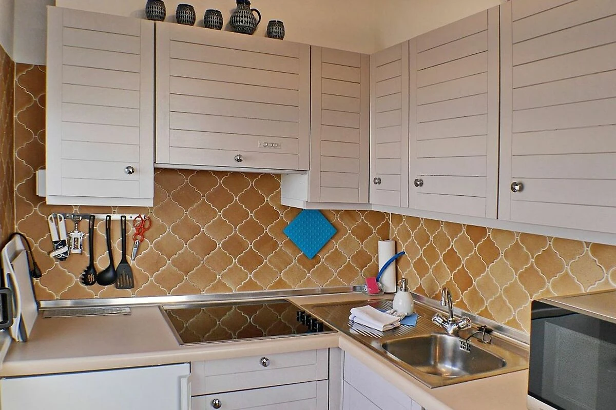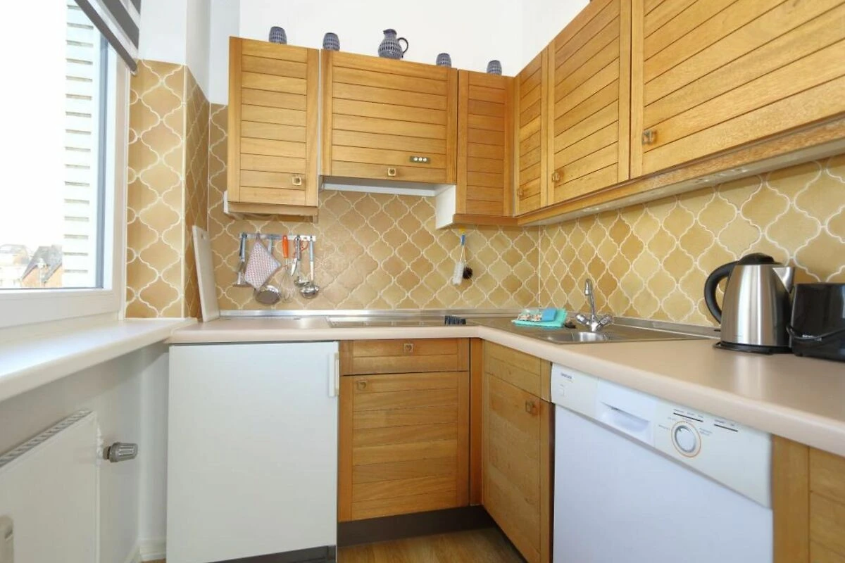 Die separate Küchenzeile ist ausgestattet mit 4-Plattencerankochfeld, 5 in 1-Multifunktionsmikrowelle, Geschirrspüler, Kühlschrank mit Gefriermöglichkeit, Kaffeemaschine, Wasserkocher, Toaster und Geschirr für den täglichen Bedarf ist selbstverständlich.