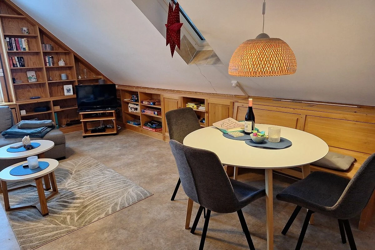 Die Ferienwohnung ist für 3 Personen geeignet und verfügt über einen offenen Wohn-Essbereich. Im Wohnzimmer steht ein Schlafsofa der 3. Person zur Verfügung. Über eine Treppe im Wohnzimmer zum Obergeschoss erreicht man das Schlaf- und das Badezimmer, in dem sich Dusche / WC befinden.