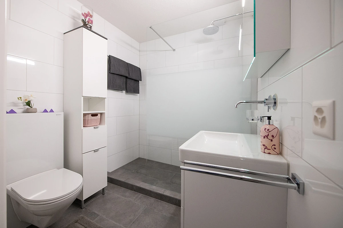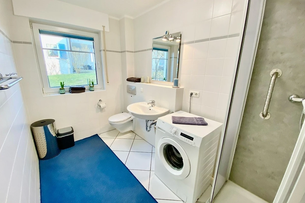 Das Badezimmer hat eine bodennahe Dusche, Toilette sowie eine Waschmaschine.