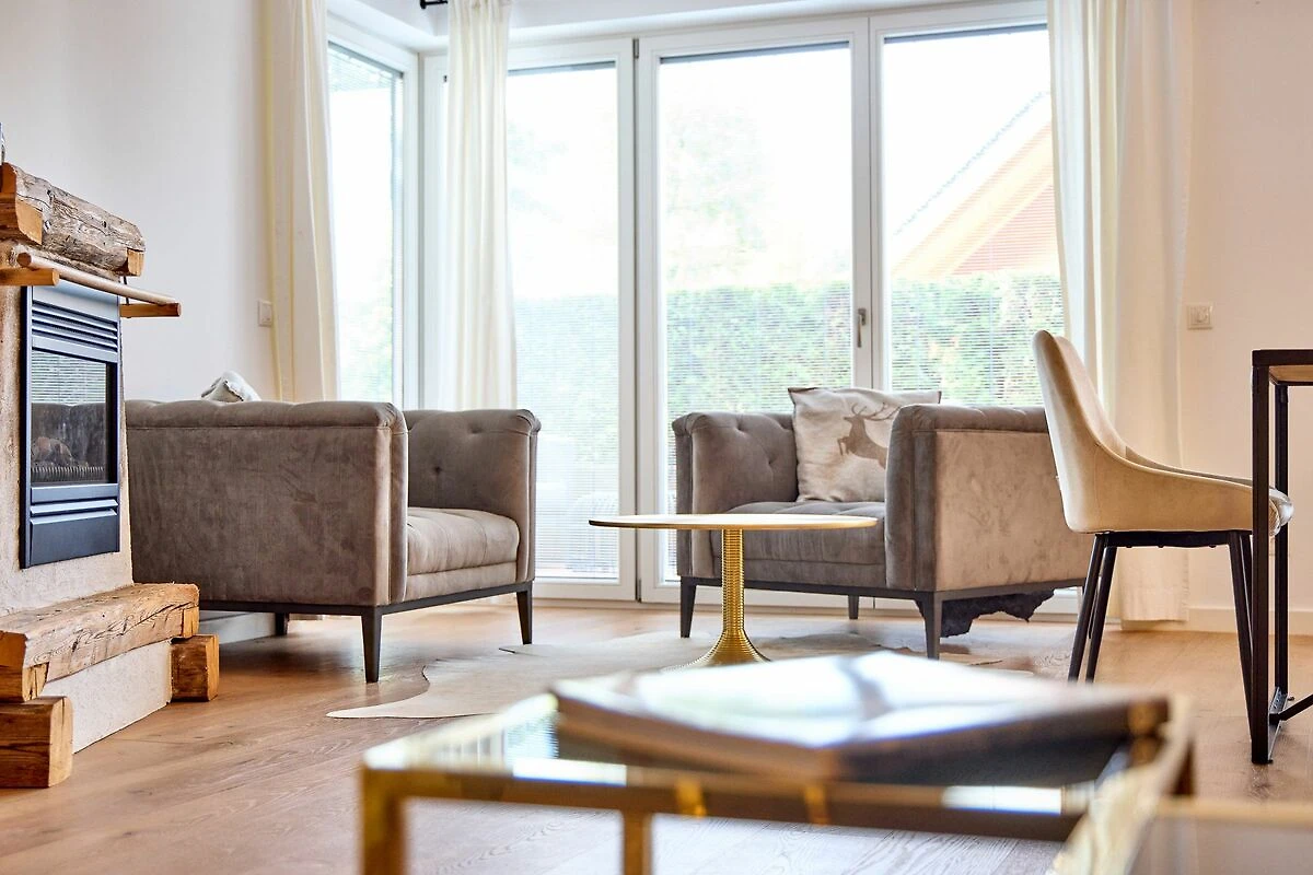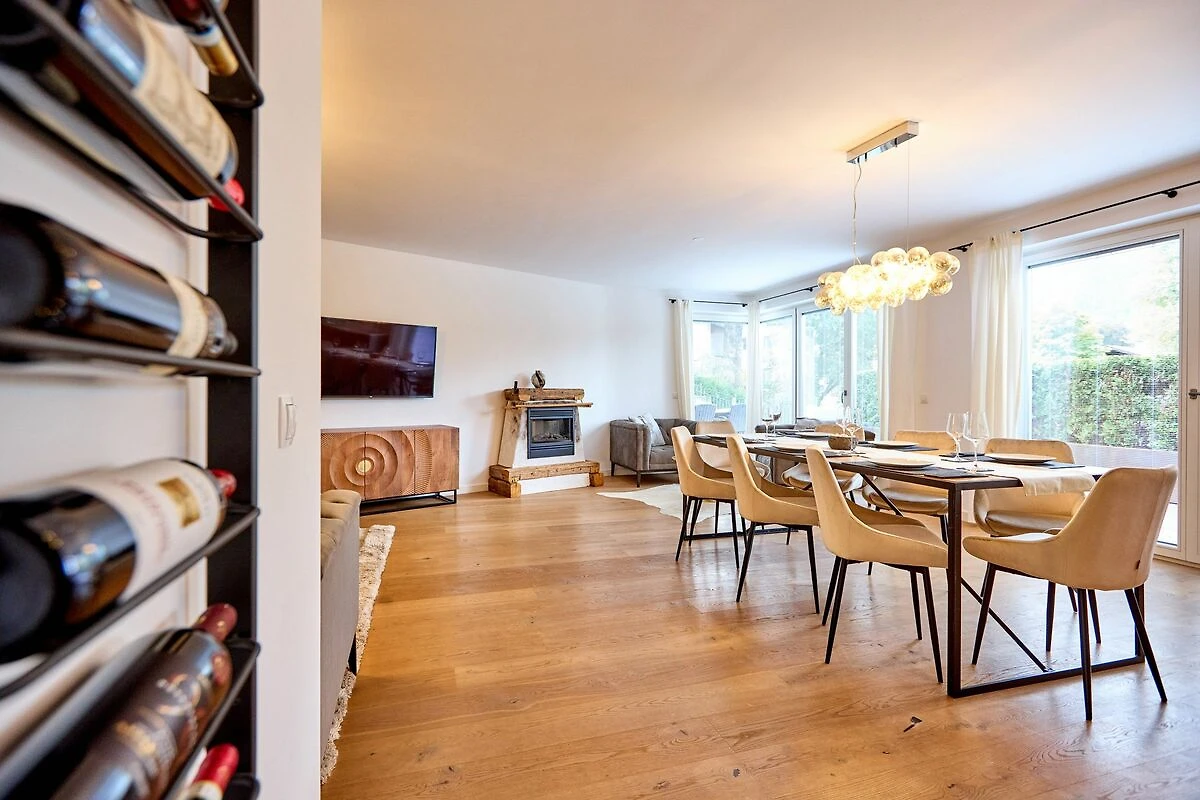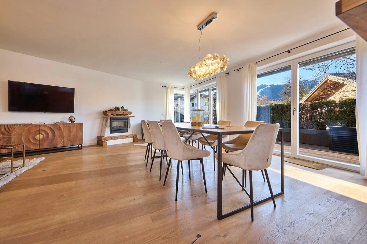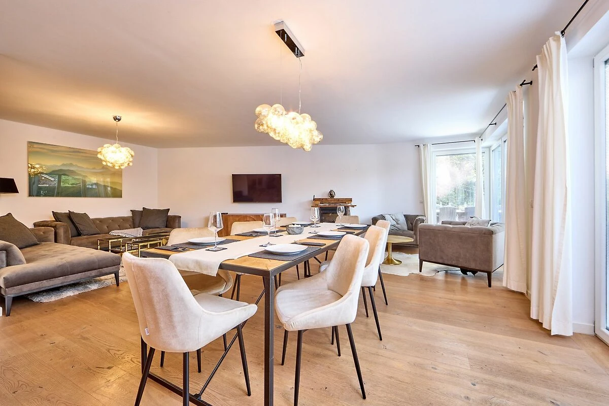 Ein großer, offen gestalteter Wohnraum mit großzügigem Esstisch mit Platz für 8 Personen vereint den idealen Ort zum Zusammenkommen mit einer modernen, voll ausgestatteten Küche, in der Sie Ihre kulinarischen Ideen verwirklichen können. Eine einladende Wohnlandschaft lädt zum Füße hochlegen ein. Ein großer Flachbild-Smart TV sorgt bei Bedarf für die nötige Unterhaltung. Ein Elektrokamin verbreitet auch an kalten Tagen kuscheliges Ambiente. Der hölzerne Boden und das Mobiliar in natürlichen Materialien vereinen einen gewissen alpinen Charme und Gemütlichkeit mit modernem Design. Bodentiefe Fenster lassen Tageslicht in den Wohnraum und ermöglichen direkten Zugang zur großen Terrasse.