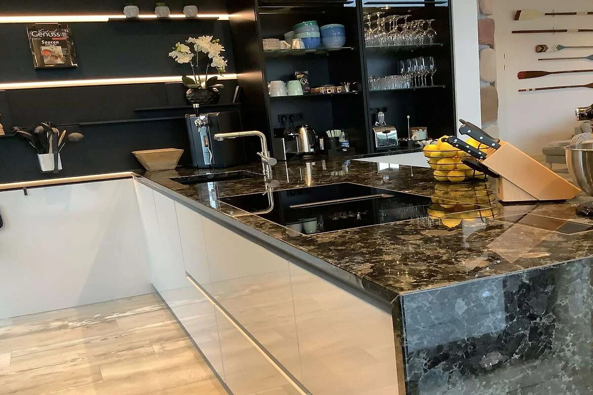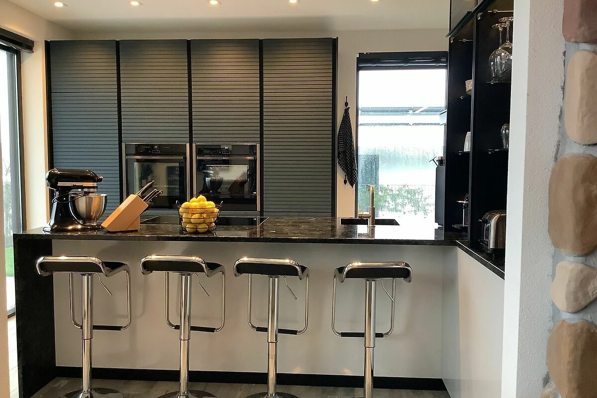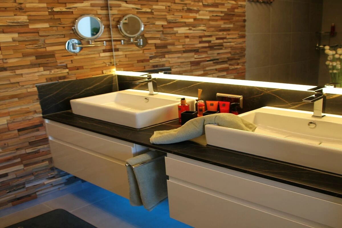 Parterre: (Eingang, offene Küche(Bar(Esstheke), Kochplatte(Induktion), Kaffeemaschine(cups, Espresso), Kaffeemaschine(Filter), Backofen(Dampf), Backofen(Grillofen), Spülmaschine, Kühl-/Gefrierkombination, Küchenmaschine), Wohn/Esszimmer(TV(smart TV), Esstisch(7 Personen), Dekokamin, Sitzecke(6 Personen)), Schlafzimmer(Doppelbett(Boxspring, 180 x 200 cm), TV(smart TV), Dekokamin), Schlafzimmer(Doppelbett(Boxspring, 180 x 200 cm), TV(smart TV), Dekokamin, Klimaanlage), Schlafzimmer(Doppelbett(Boxspring, 180 x 200 cm), TV(smart TV), Dekokamin, Klimaanlage), Badezimmer(Dusche(ebenerdige Dusche), Waschbecken, Waschbecken, Toilette), Badezimmer(Dusche(ebenerdige Dusche), Waschbecken, Waschbecken, Toilette), Toilette(Waschbecken, Toilette), Abstellraum(Trockner, Waschmaschine))