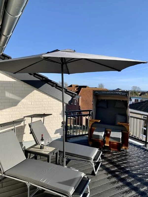 - 30 m² großer Balkon (Ausrichtung Süd/Ost) mit Strandkorb, Sonnenliegen, Tisch, Stühlen und Sonnenschirm