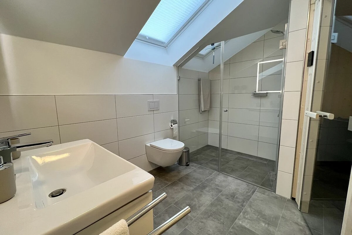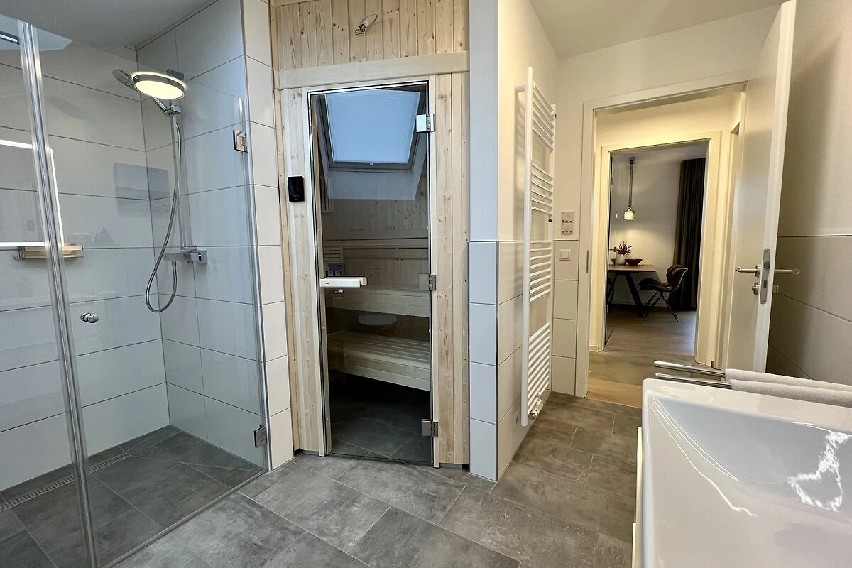 - ein geräumiges Bad mit bodentiefer Dusche, Sauna