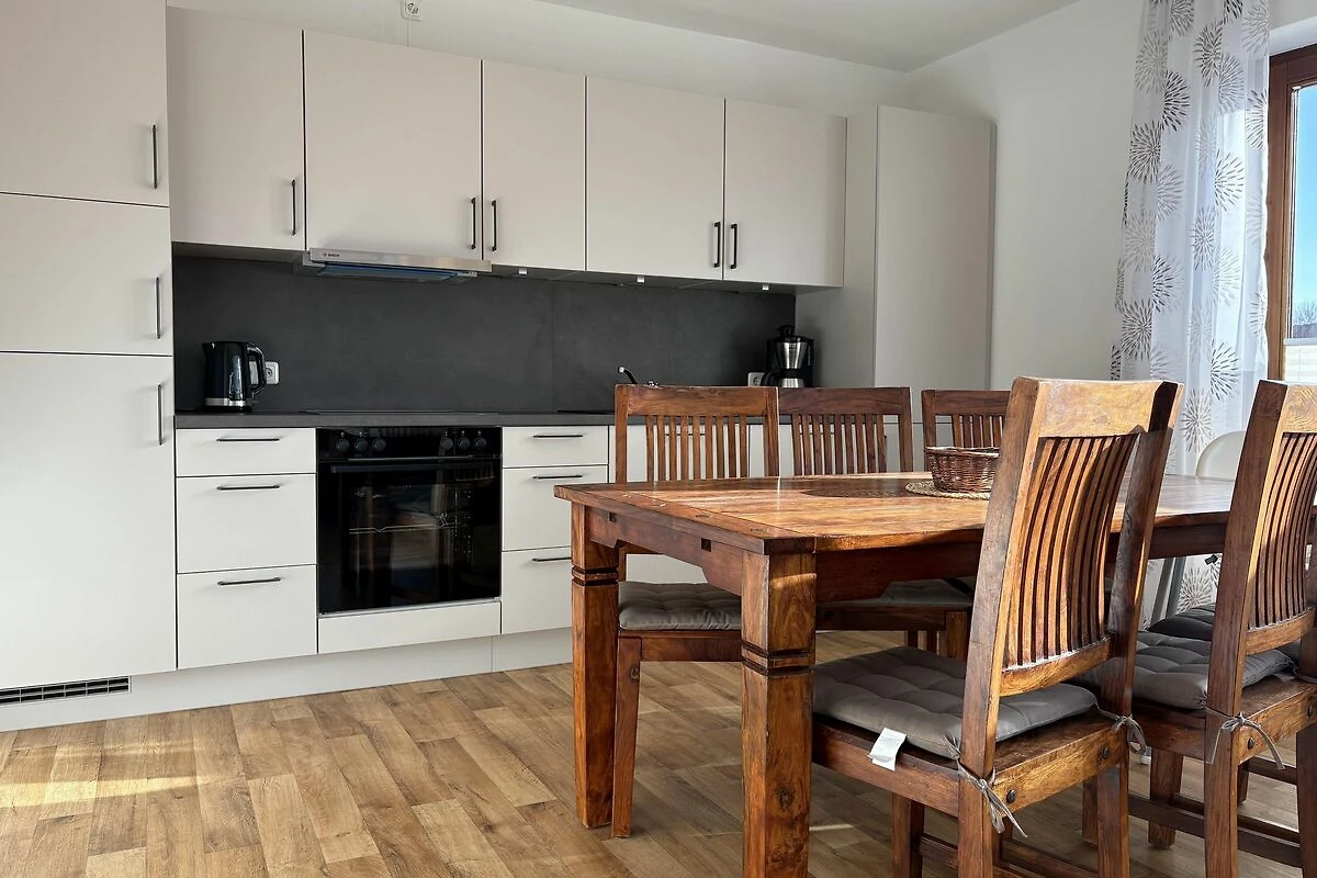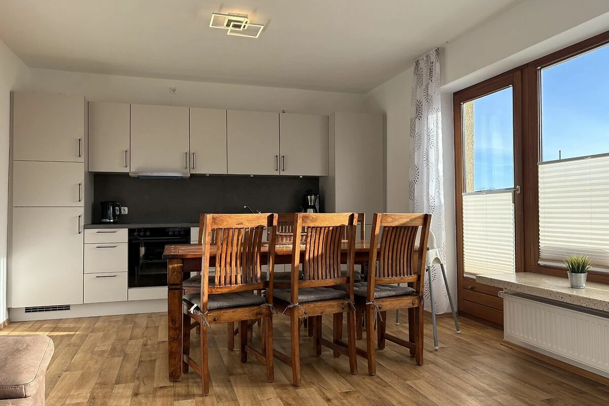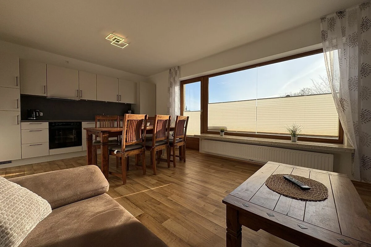 - Wohn-, Esszimmer mit integrierter voll ausgestatteter Küche mit Geschirrspüler und Backofen
