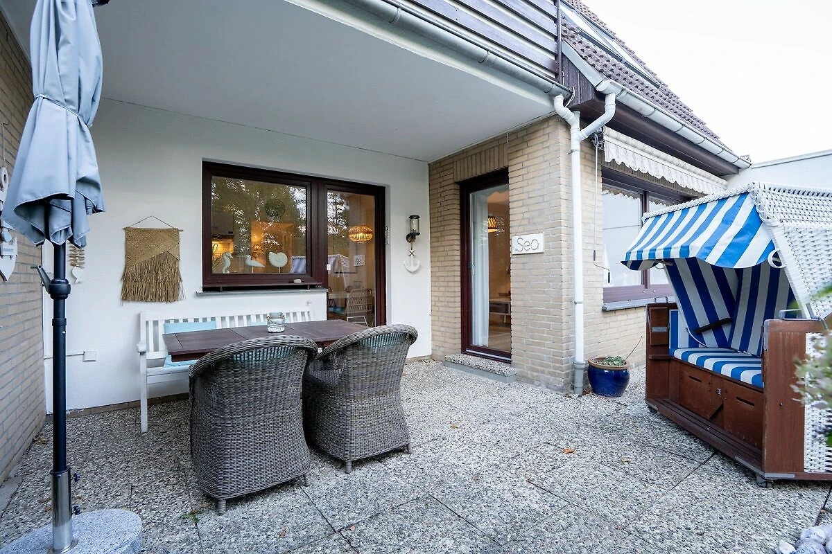 Meinsweg 71, ca. 65 m², ebenerdig Reihenendhaus, großer Garten, möblierte und teilüberdachte Süd-Terrasse mit Strandkorb und Markise,, Wohnzimmer mit Doppelschlafcouch (1,60 x 2,00 m), TV, WLAN, Schlafzimmer mit Doppelbett und TV, separate Einbauküche mit Geschirrspülmaschine, Backofen und Mikrowelle, Gefrierfach, Essecke, Tageslichtbad Dusche / WC ,Badrenovierung in 2023, Kinderreisebett und Hochstuhl vorhanden, Pkw-Stellplatz , keine Haustiere, Bettwäsche und Handtücher bitte mitbringen oder spätestens zwei Tage vor Anreise gegen Gebühr bestellen.