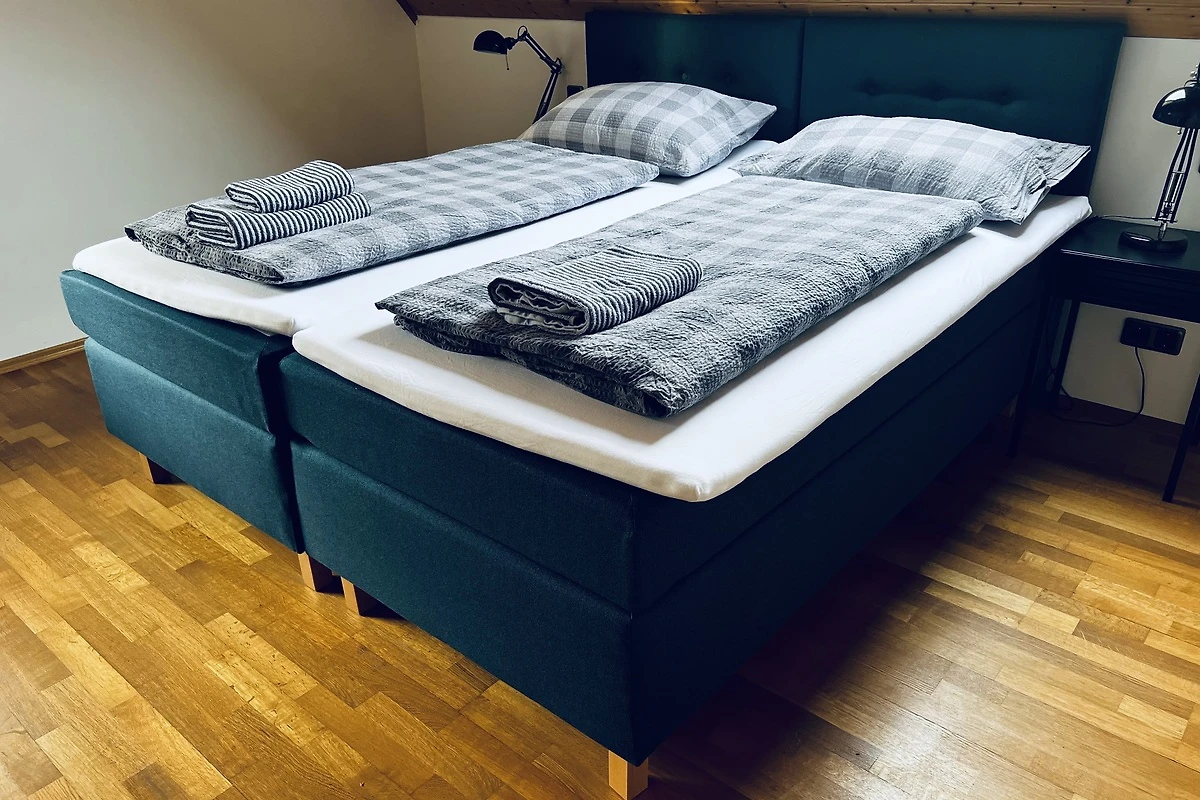 Alle Zimmer sind mit modernen Boxspringbetten ausgestattet, sodass sie flexibel als Twin- oder Doppelzimmer genutzt werden können.