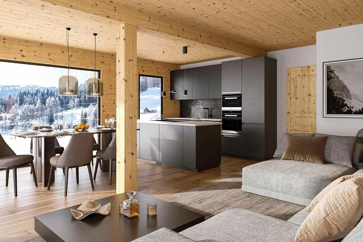 Der geräumige Wohnbereich ist mit einer gemütlichen Sitzgruppe und einem Flachbildfernseher auf Komfort und Entspannung ausgerichtet. Vom Balkon aus haben Sie einen herrlichen Blick auf den Kreischberg und können so Ihren Aufenthalt in aller Ruhe genießen. Die moderne Küche ist mit hochwertigem Besteck, Kochgeschirr, Cerankochfeld, Backofen, Mikrowelle, Kühlschrank mit Gefrierfach und Geschirrspüler ausgestattet. Weitere Geräte wie ein Wasserkocher, ein Toaster und eine Nespresso-Kaffeemaschine sind ebenfalls vorhanden.