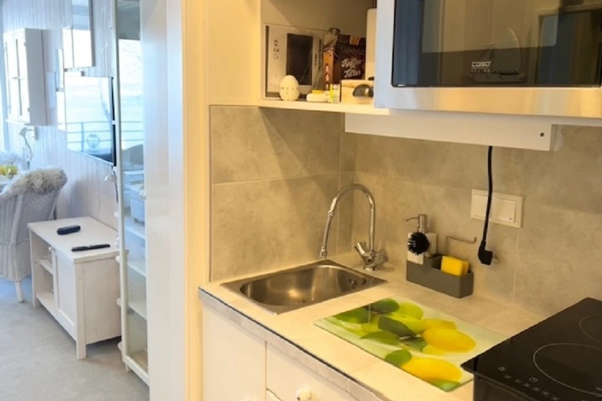 Das Apartment verfügt über eine praktische Pantryküche, die es Ihnen ermöglicht, Ihre Mahlzeiten selbst zuzubereiten – beispielsweise in der modernen Mikrowelle mit Grill- und Backfunktion. Auf den Parkdecks des Gebäudes stehen kostenfrei nutzbare Parkplätze in begrenzter Anzahl zur Verfügung, allerdings ohne feste Zuordnung oder Reservierungsmöglichkeit.