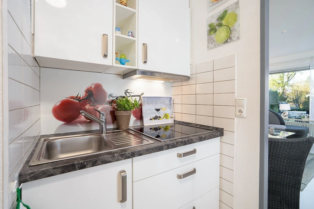 Die komplett ausgestattete Pantryküche mit klassischer Kaffeemaschine erfüllt alle Wünsche. Das Schlafzimmer ist mit einem komfortablen Boxspringbett (1,40 m x 2,00 m) ausgestattet, Rollläden sorgen für zusätzliche Verdunkelung. Das maritime Badezimmer bietet eine grosszügige Dusche sowie einen Waschtisch mit WC.