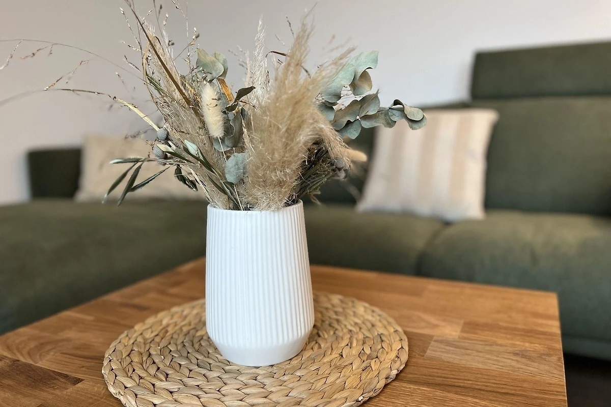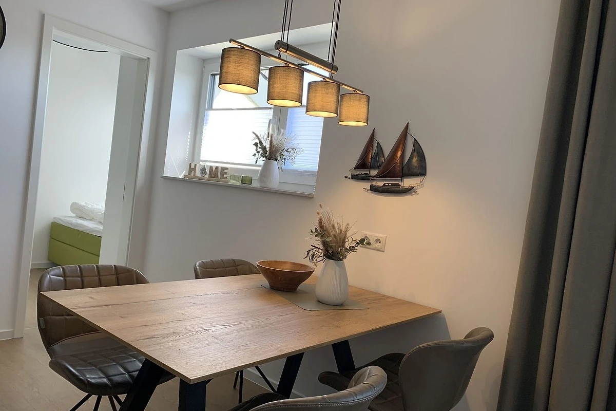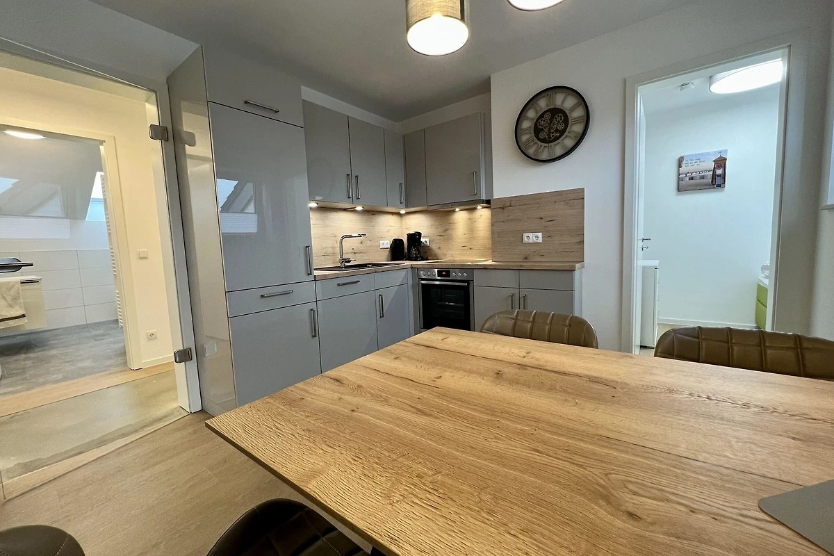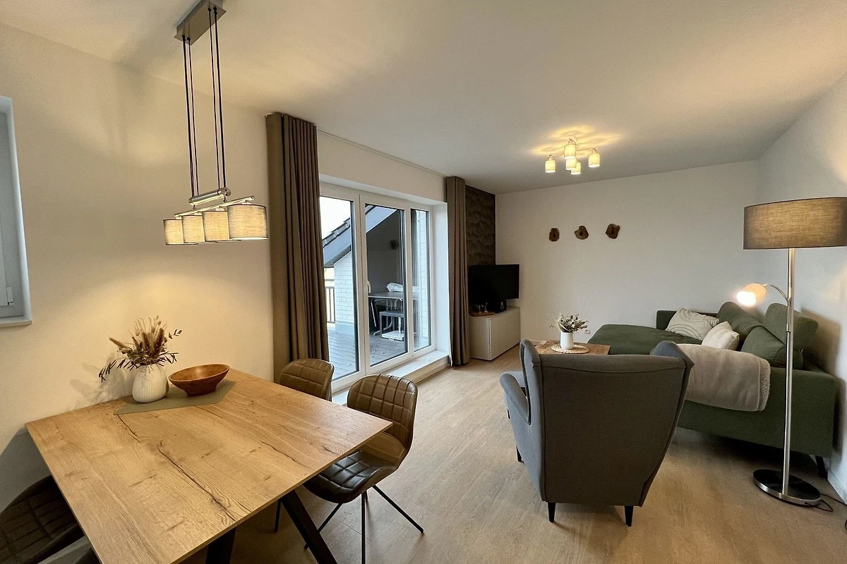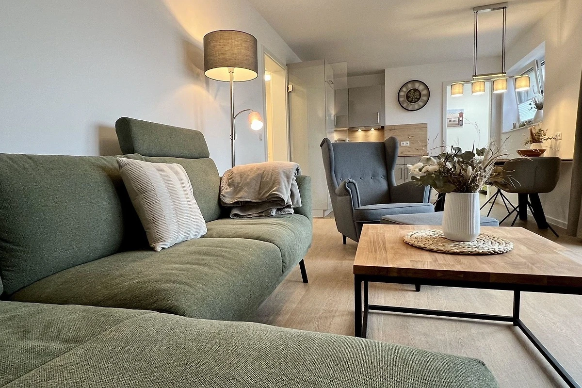 - modernes geschmackvoll eingerichtetes Wohnzimmer mit Sofa, Wohnwandsystem mit Beleuchtung, Flatscreen-TV im Wohnbereich, Musik über Bluetooth - offene voll ausgestattete Küche mit Essplatz für 4 Personen