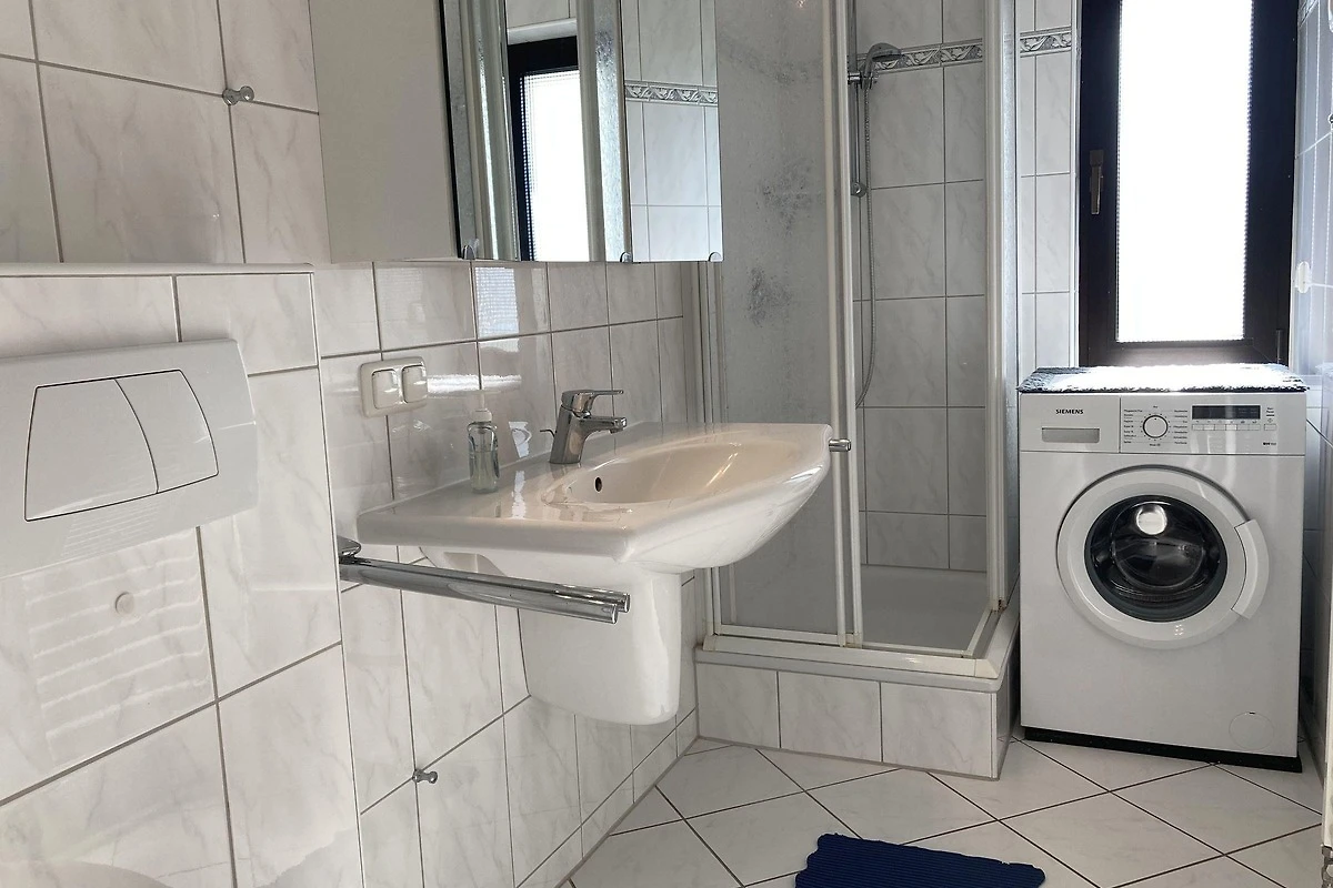 Ein tageslichthelles Badezimmer mit WC und Waschmaschine steht zur alleinigen kostenfreien Nutzung zur Verfügung. Zur gemeinschaftlichen Nutzung (gegen Gebühr) befinden sich im Keller des Hauses Waschmaschine und Trockner.