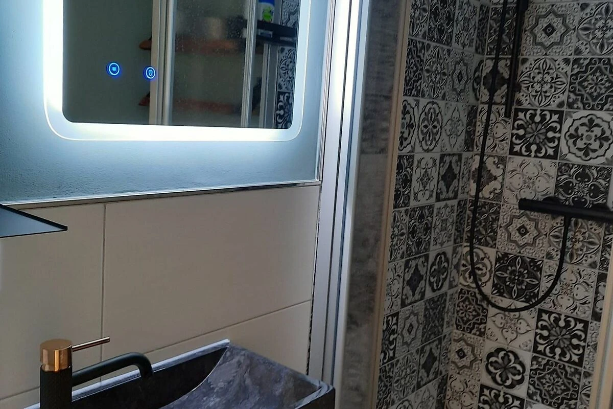 Vom Eingangsbereich gleich rechts gehalten geht es in das schicke Duschbad mit WC. Die moderne Dusche, eine Handtuchheizung sowie der beleuchtete und beheizbare Spiegel über dem Waschbecken bieten aller höchsten Komfort.