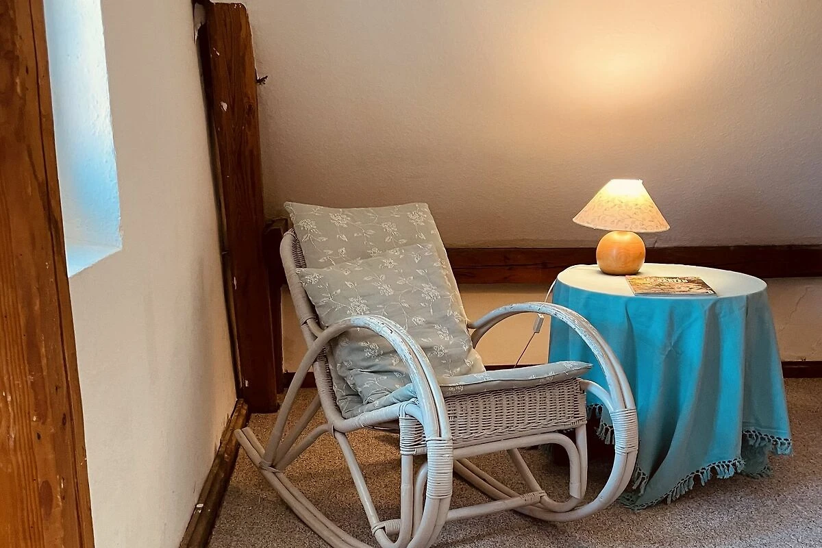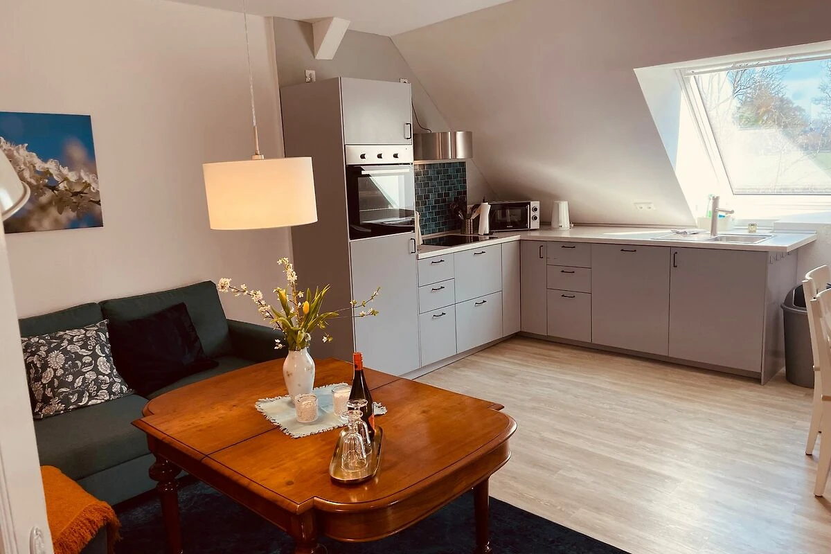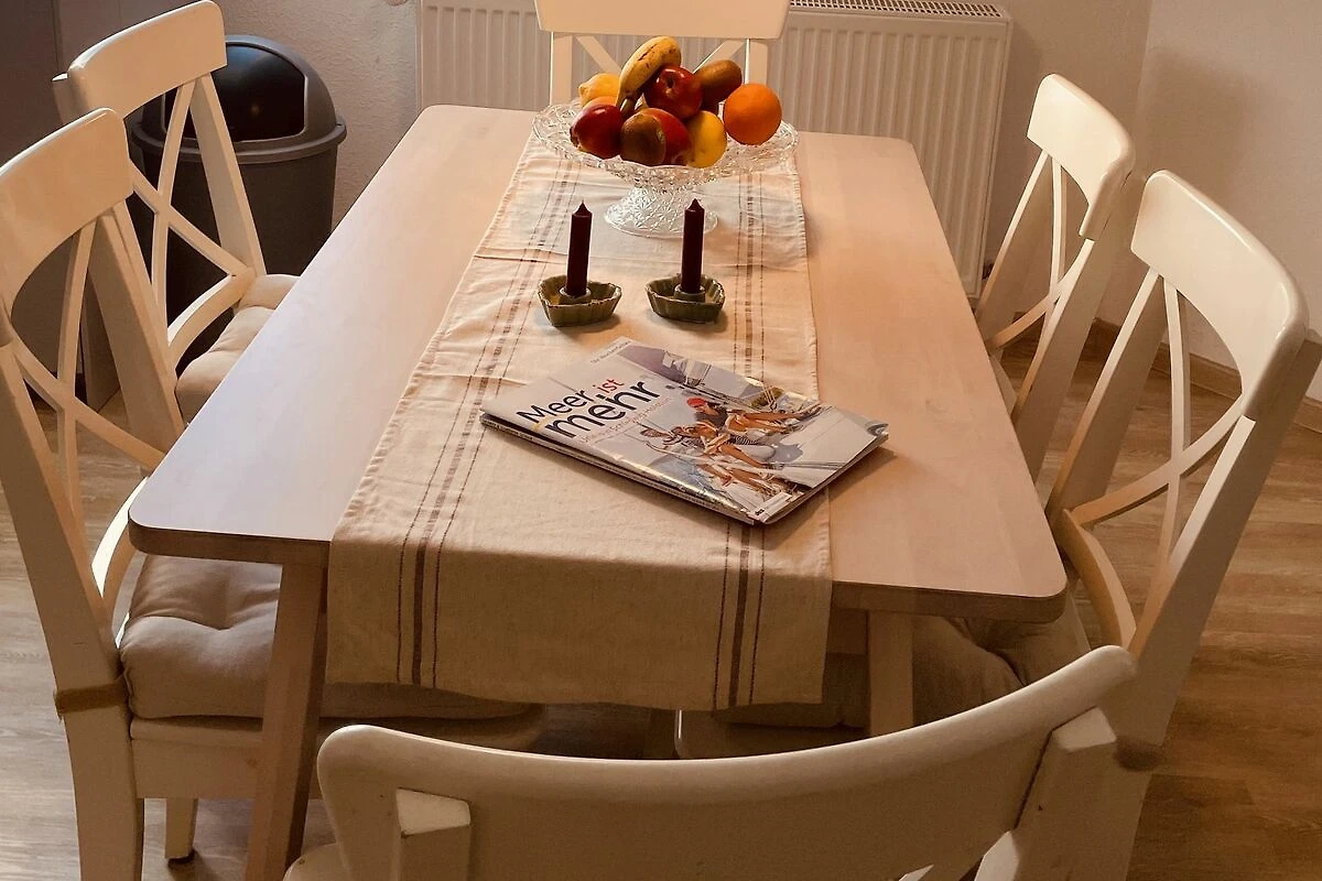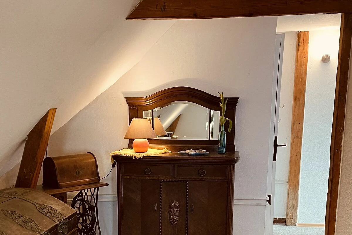 Die Einrichtung ist in einem klaren Stil gehalten, der durch antike Landhausmöbel akzentuiert wird. Die Räume sind hell, die Sonne begrüsst einen zum Frühstück und schaut zum Abend nochmal in die Schlafräume. Zudem bietet die Wohnung einen schönen, weiten Blick in den grossen Garten.