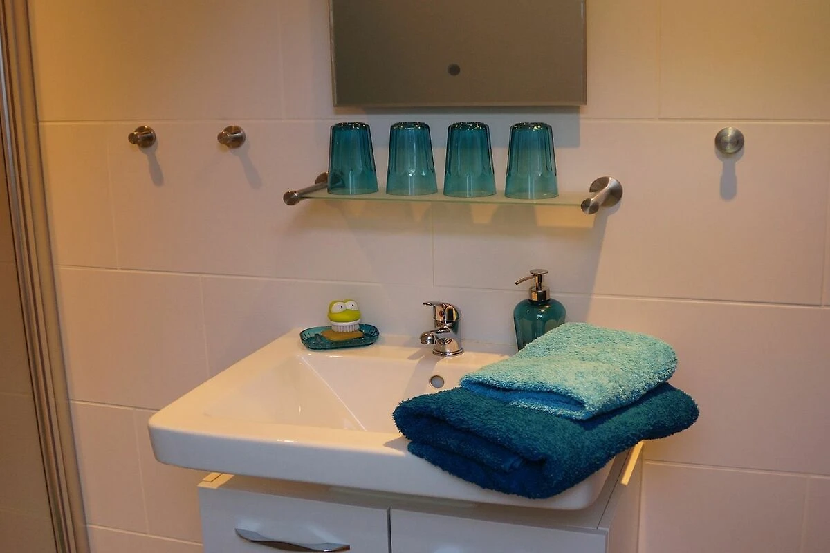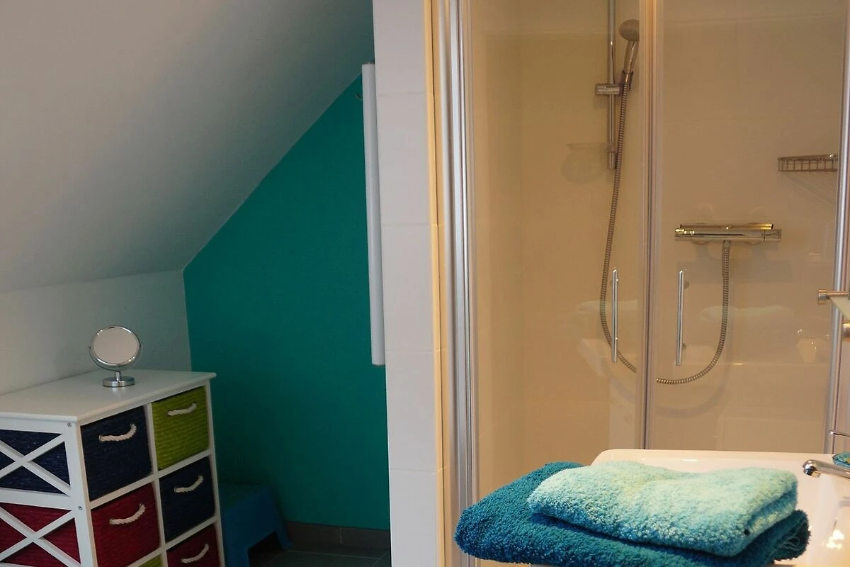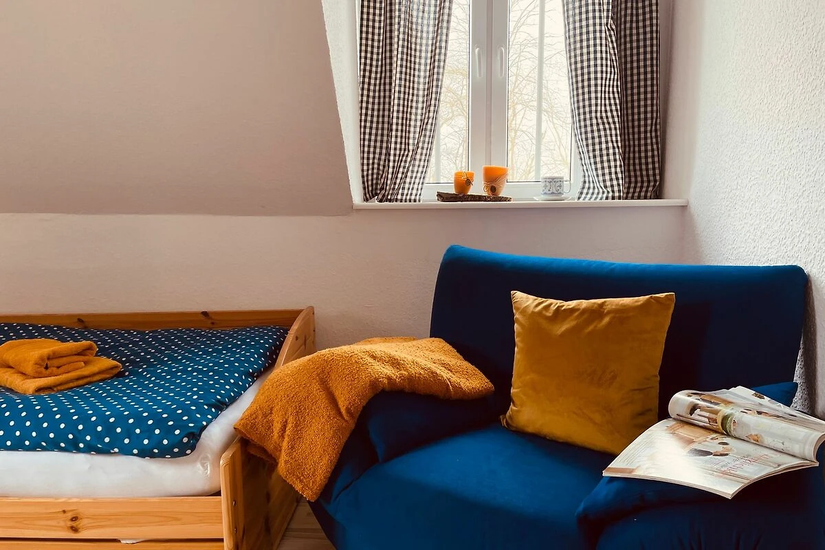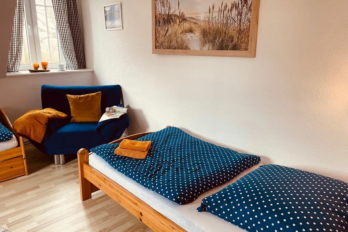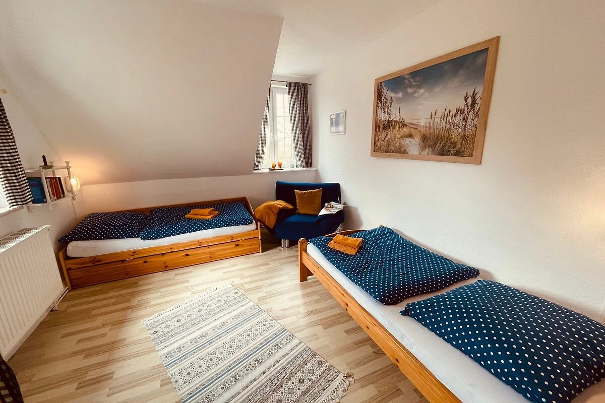 Die Wohnung Weitblick befindet sich im ersten Obergeschoss auf der rechten Seite des Hauses. Sie verfügt über eine grosszügige Wohnküche, einem Duschbad, einem Schlafzimmer mit Doppelbett und ein weiteres Schlafzimmer mit zwei Einzelbetten.