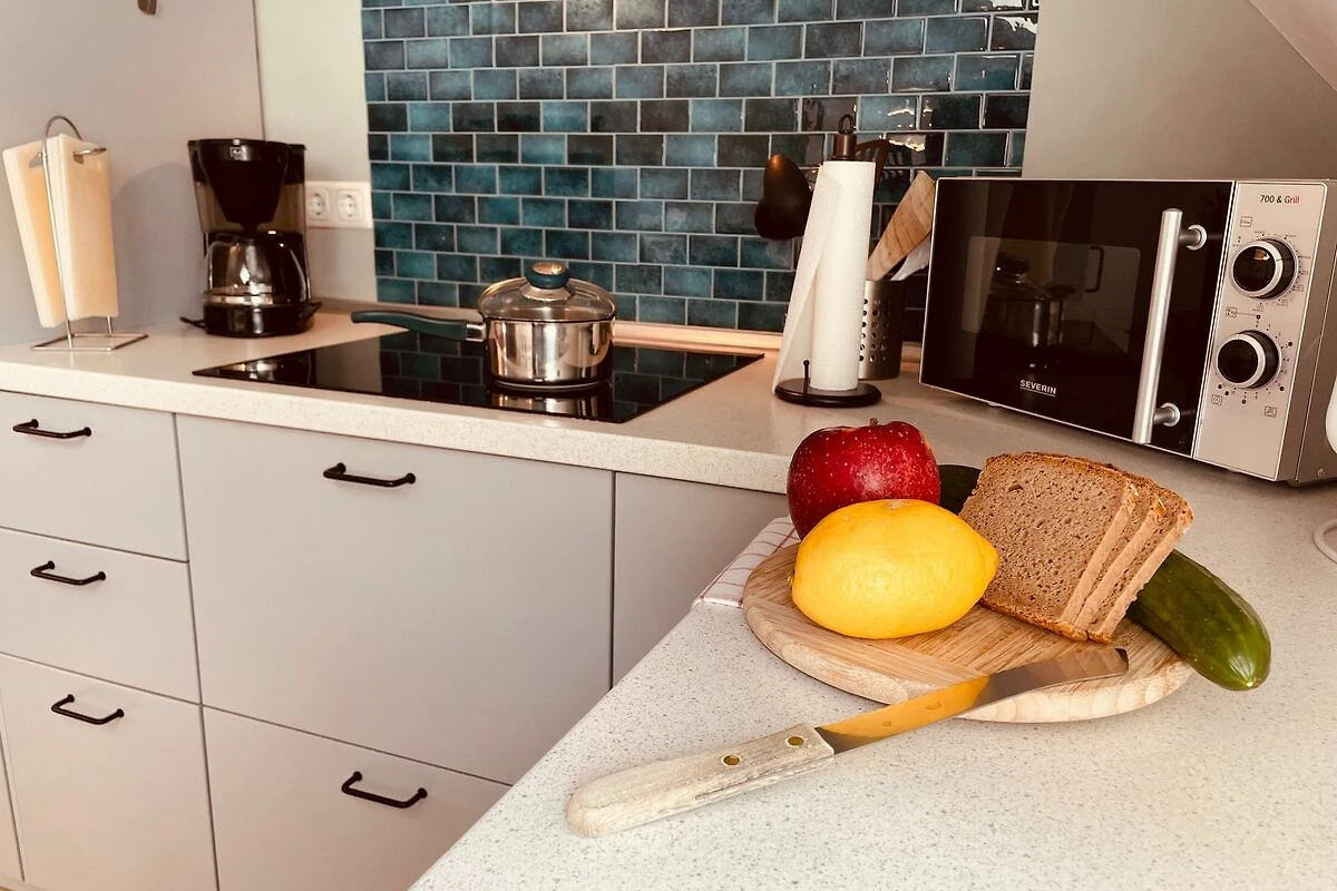 Die geräumige Wohnküche lädt zum geselligen Treffpunkt ein. Die zwei grossen Tische bieten Platz für unterschiedliche Aktionen, so dass beispielsweise an einem gegessen und an dem anderen gespielt werden kann.